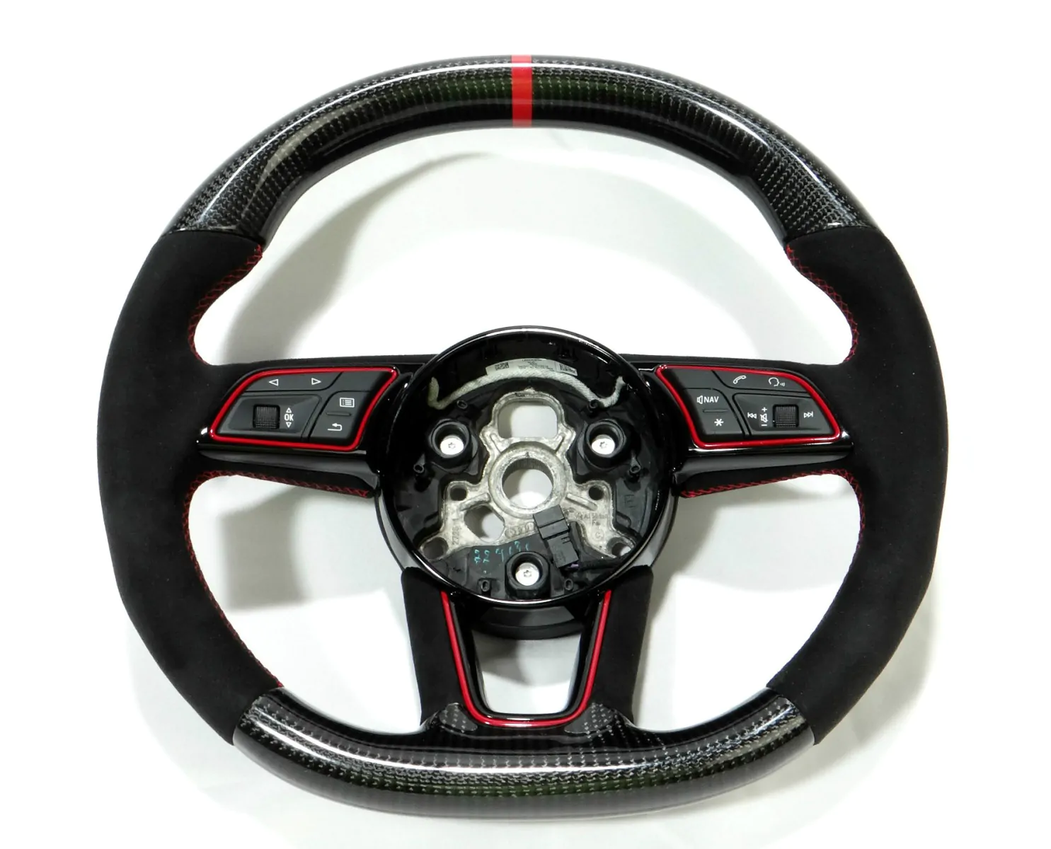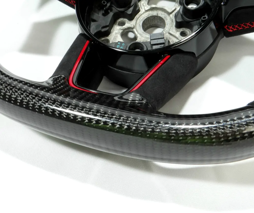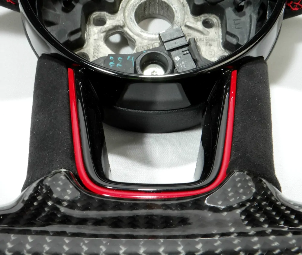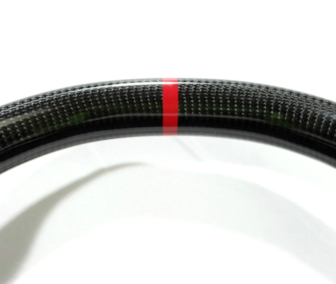 Elegant steering wheel will be a unique addition to the interior of your car! Convenient anatomy, soft original skin in combination with a Red stitching will cause only pleasant driving sensations! Unique anatomy (Made on polyurethane, not putty). Changed geometry (flat top and bottom). Inserts made with real carbon fiber. Black glossy center with red glossy dedicated lines. Red vinyl stripe under coating on top.Authentic. Refurbished. Airbag is not included.