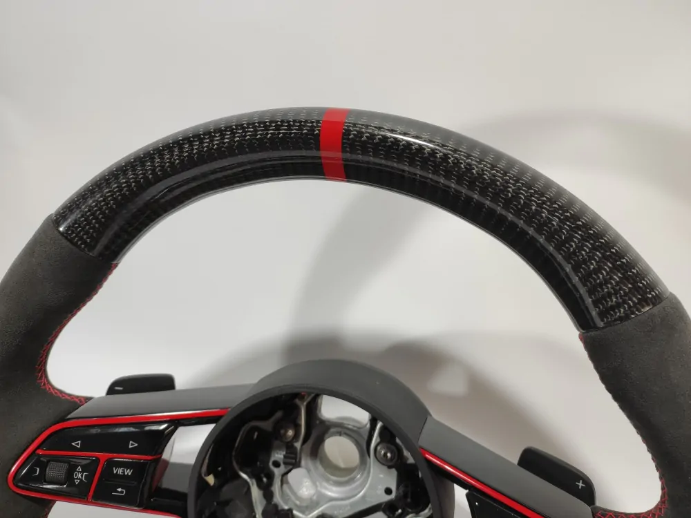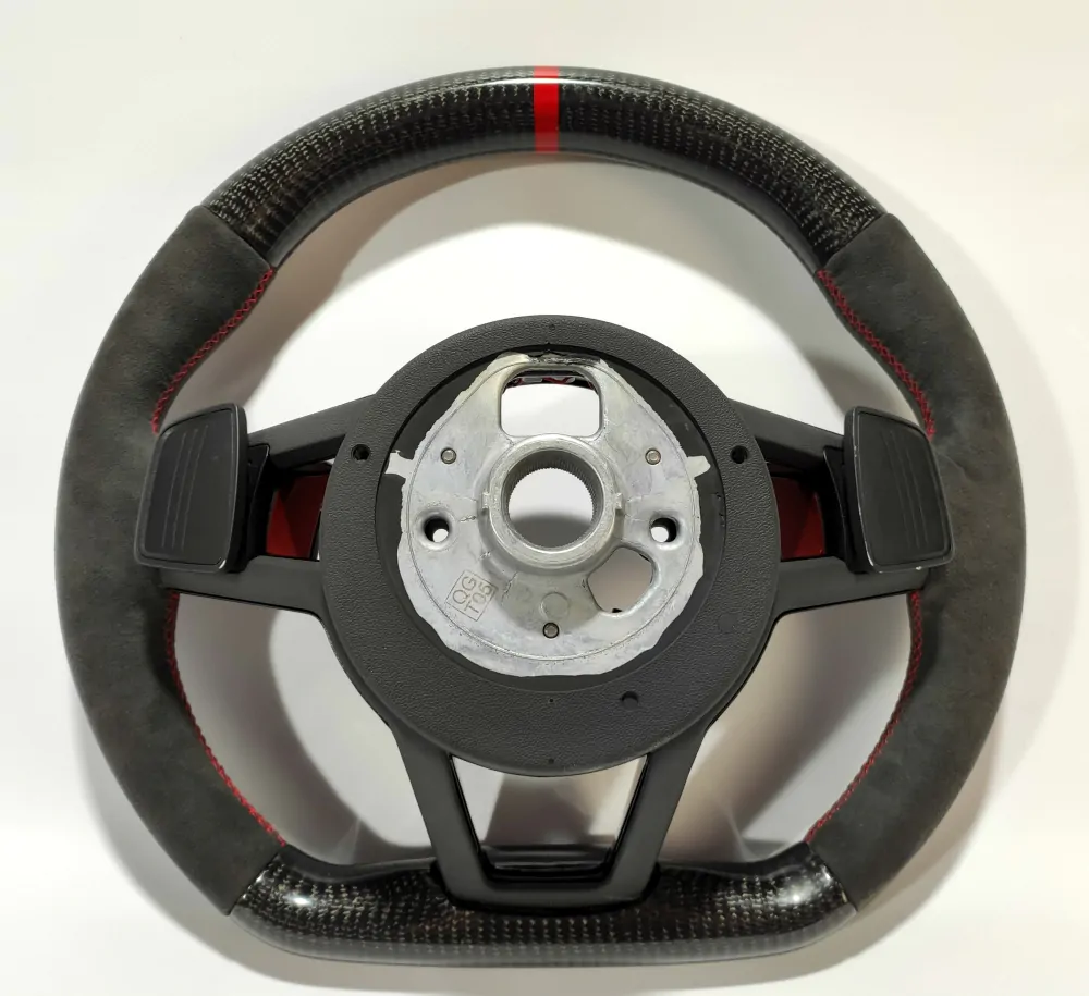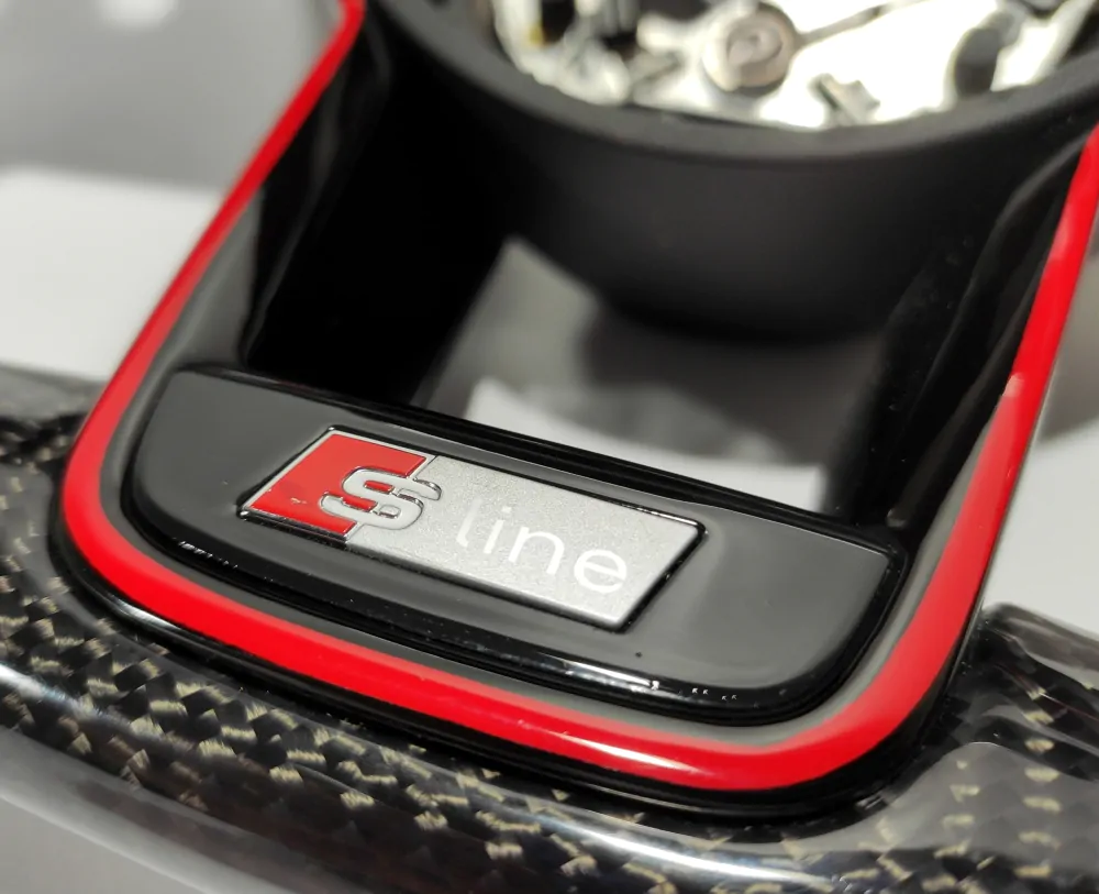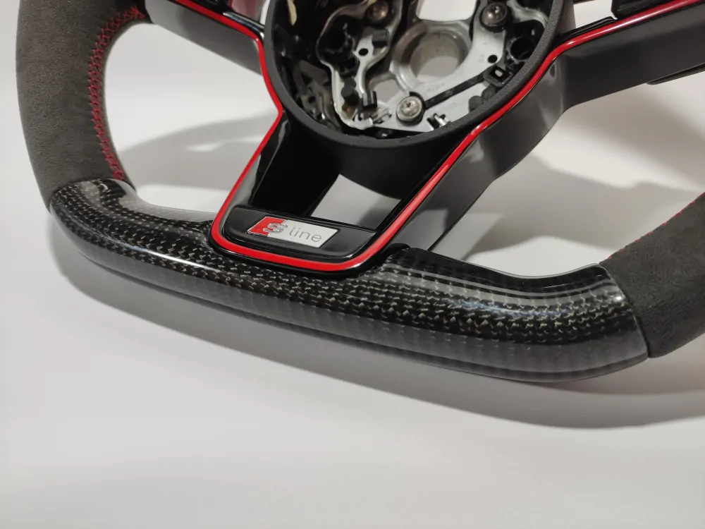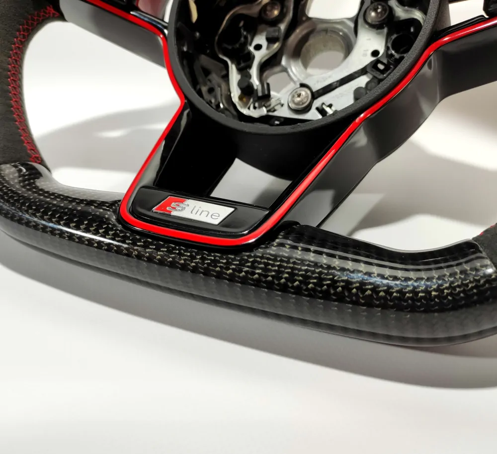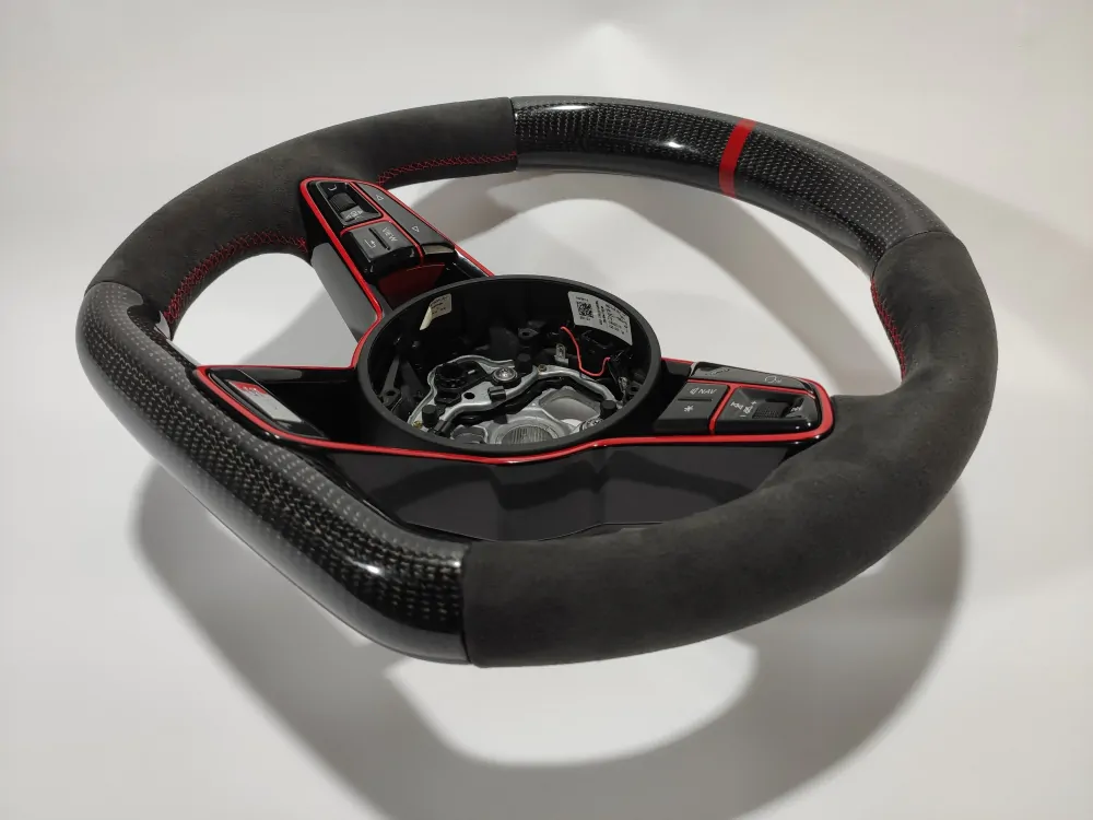 Elegant steering wheel will be a unique addition to the interior of your car! Convenient anatomy, soft original skin in combination with a Red stitching will cause only pleasant driving sensations! Unique anatomy (Made on polyurethane, not putty). Changed geometry (flat bottom). Inserts made with real carbon fiber. Black glossy center with red glossy dedicated lines. Metallic “S Line” badge mounted into center. Red vinyl stripe under coating on top.Authentic. Refurbished. Airbag is not included.
