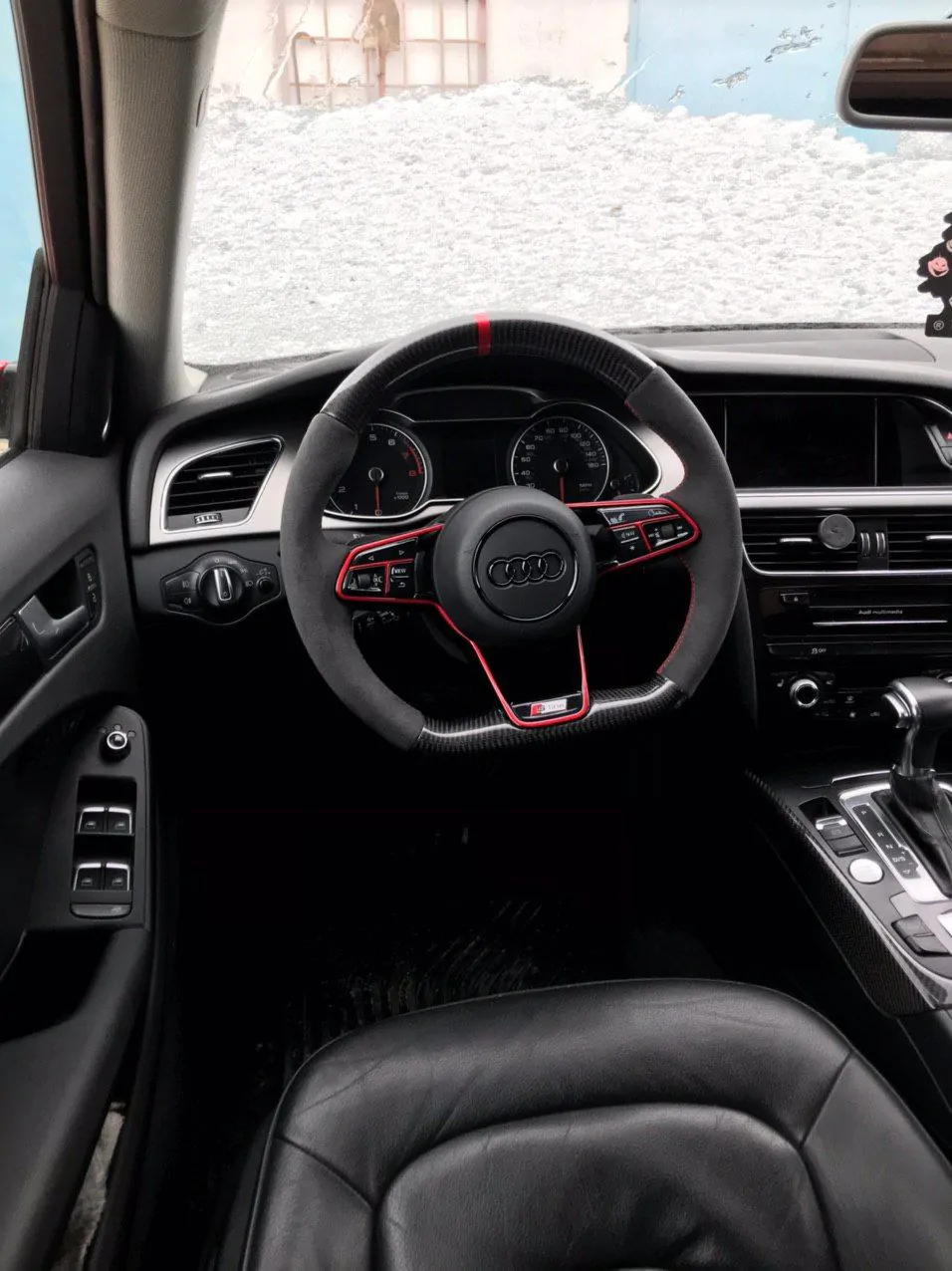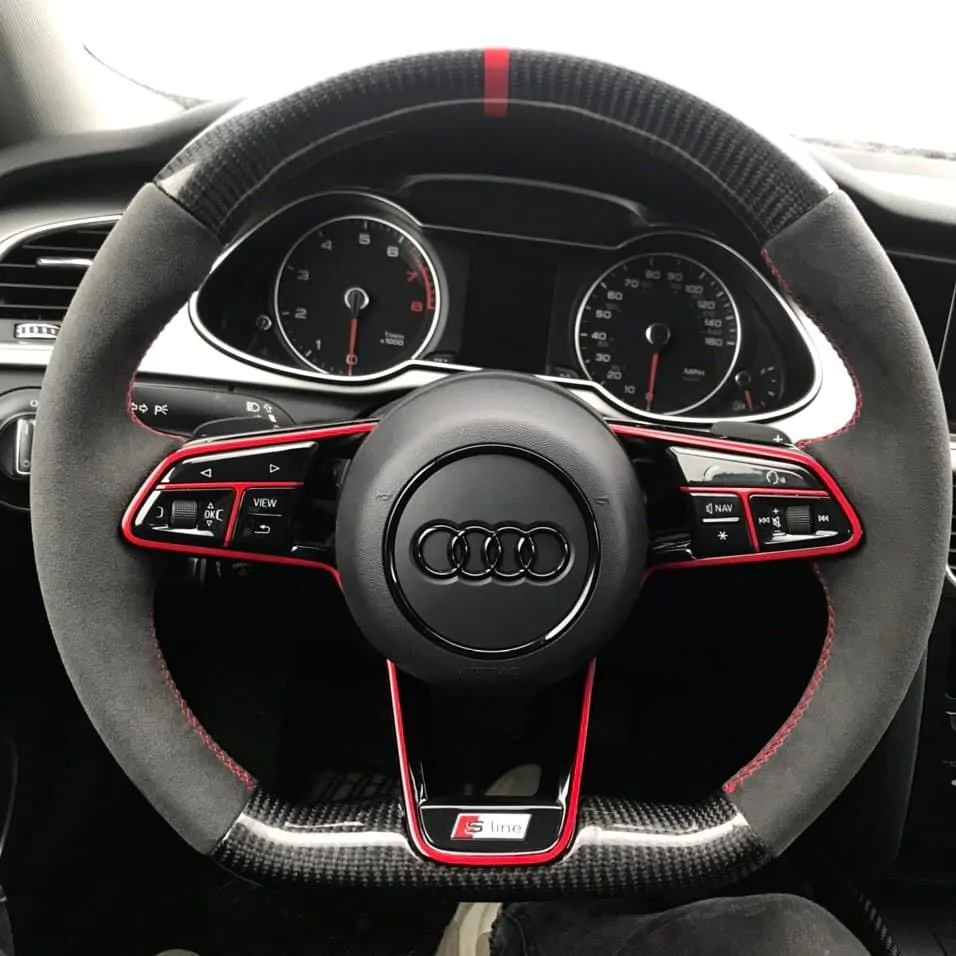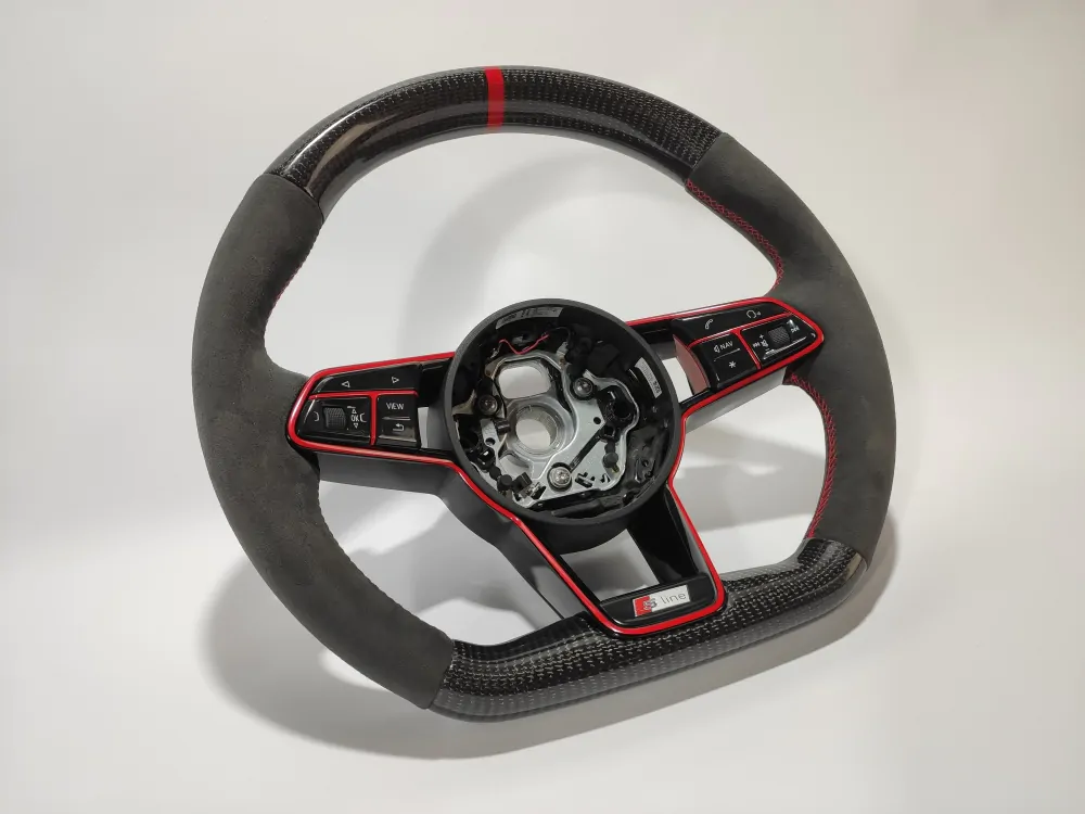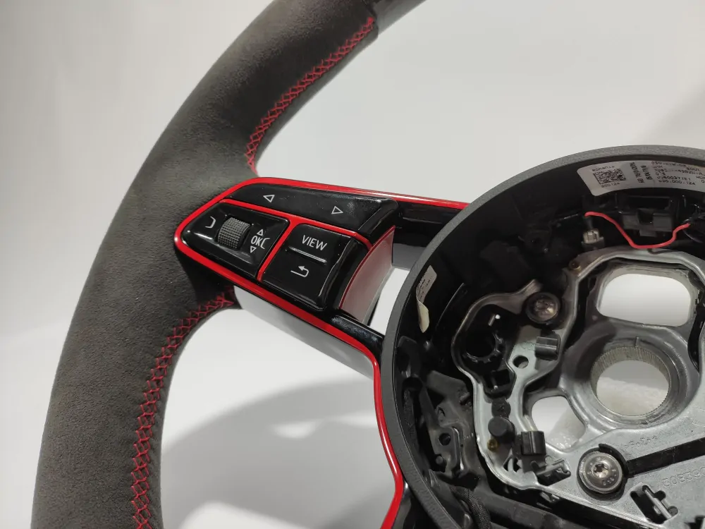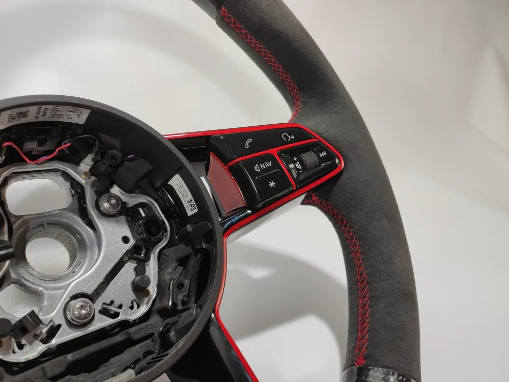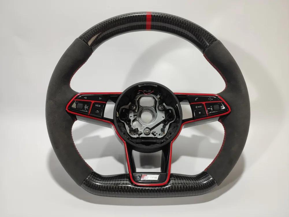 Elegant steering wheel will be a unique addition to the interior of your car! Convenient anatomy, soft original skin in combination with a Red stitching will cause only pleasant driving sensations! Unique anatomy (Made on polyurethane, not putty). Changed geometry (flat bottom). Inserts made with real carbon fiber. Black glossy center with red glossy dedicated lines. Metallic “S Line” badge mounted into center. Red vinyl stripe under coating on top.Authentic. Refurbished. Airbag is not included.