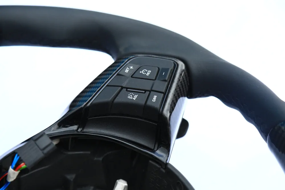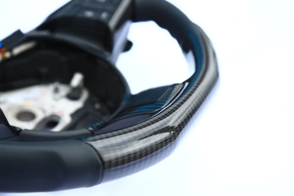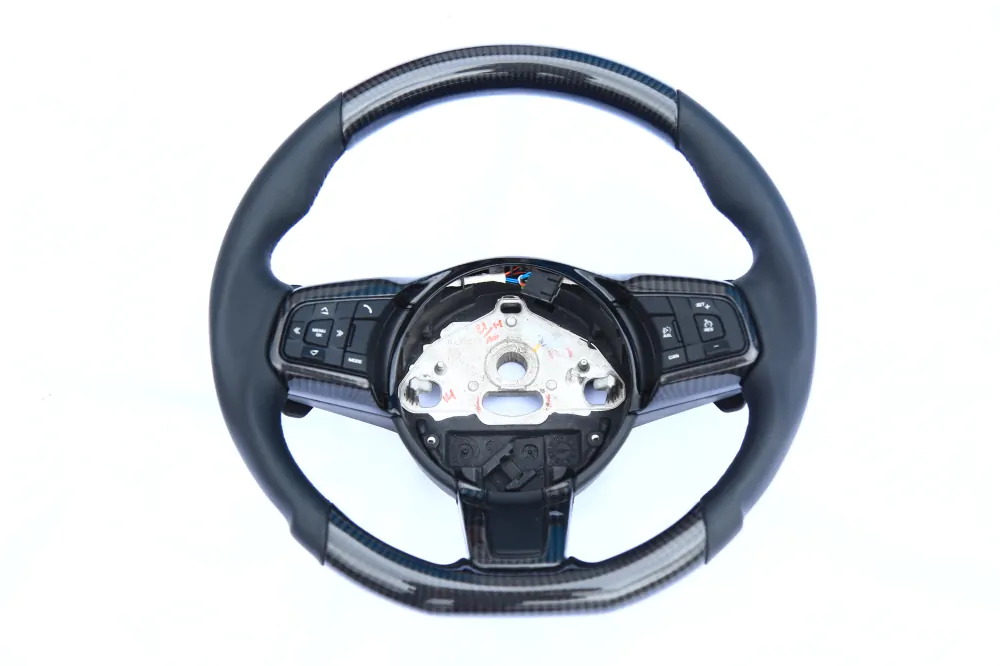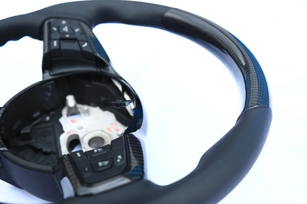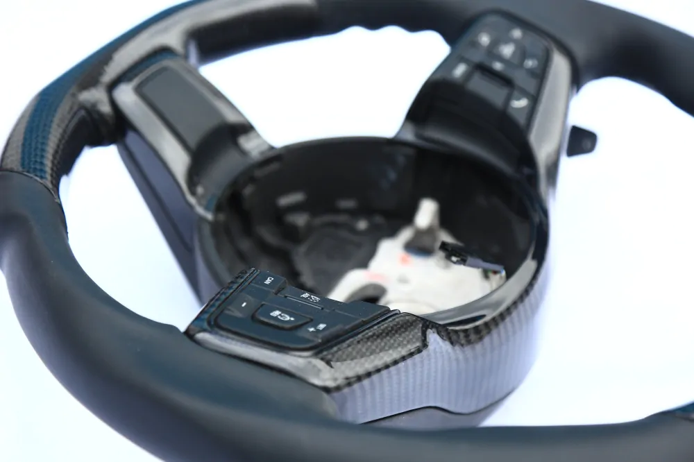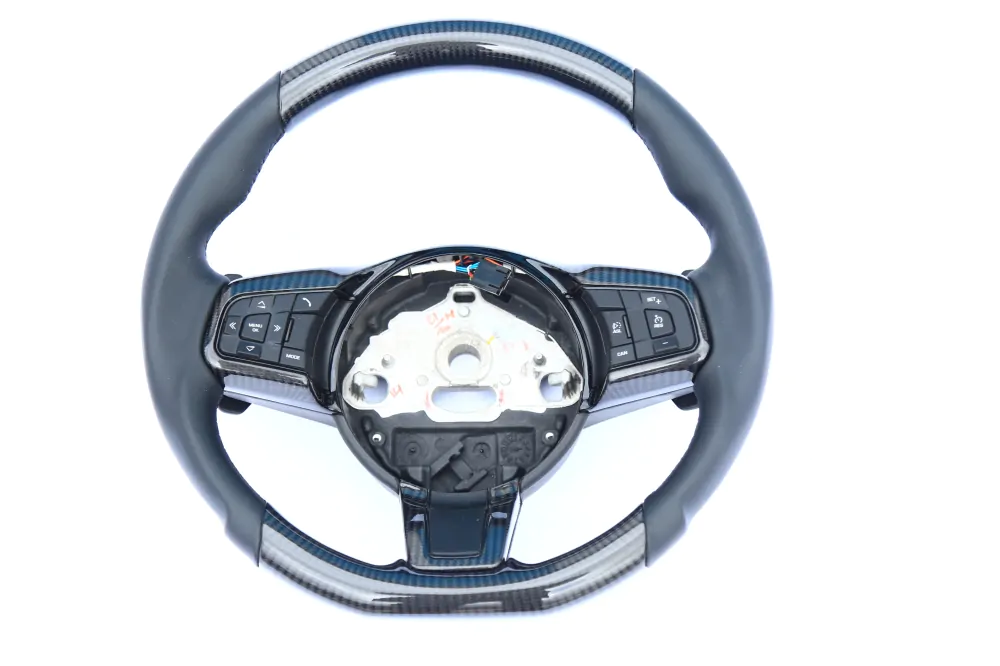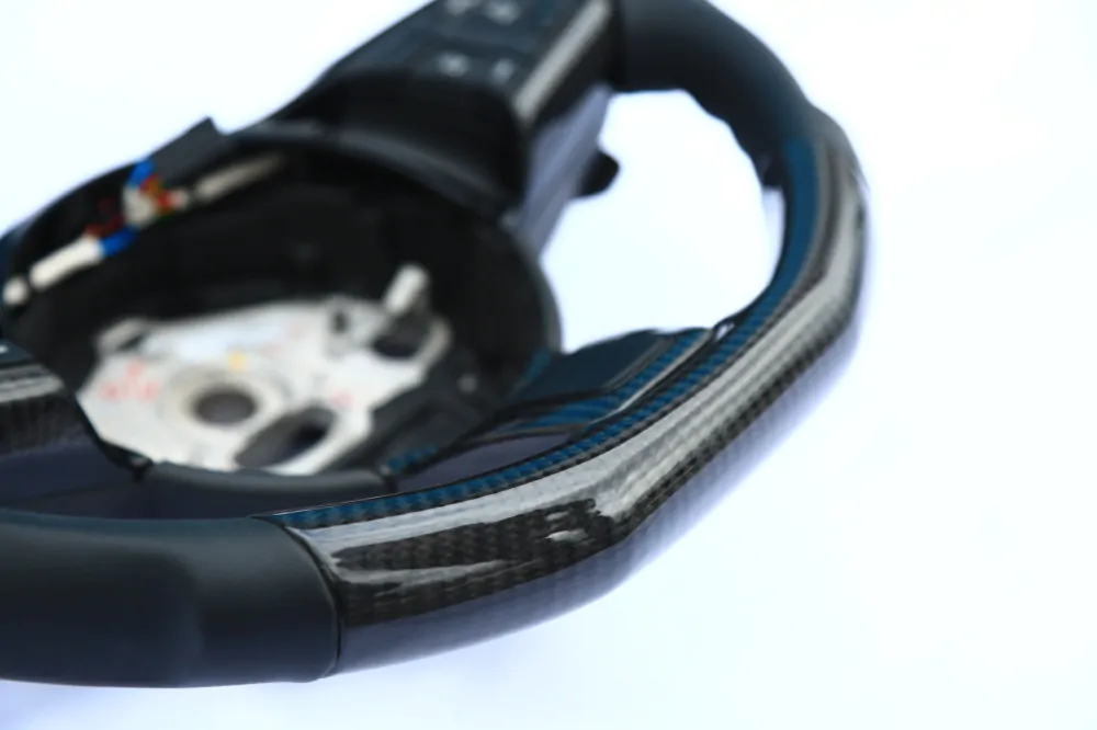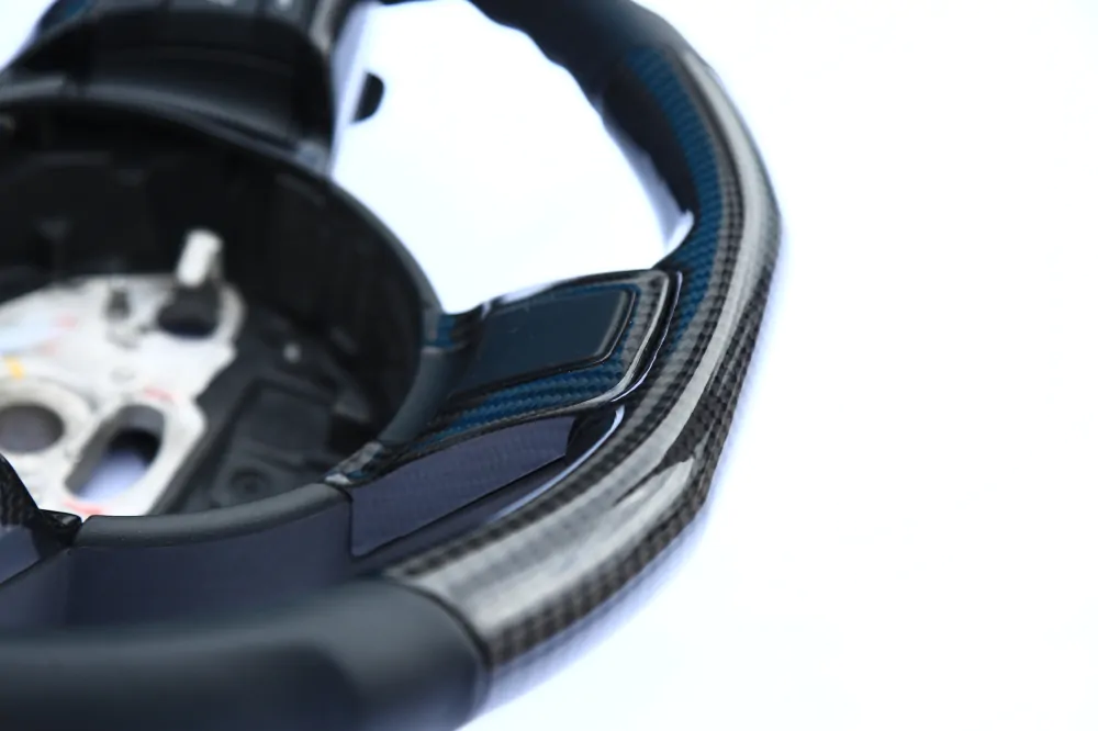 Elegant steering wheel will be a unique addition to the interior of your car! Convenient anatomy, soft original Black leather in combination with a black stitching will cause only pleasant driving sensations! Unique anatomy (Made on polyurethane, not putty). Changed geometry (flat bottom). Inserts made of real carbon fiber (carbon fiber). Black glossy center. Original paddle shifts.Authentic. Refurbished. Airbag is not included.