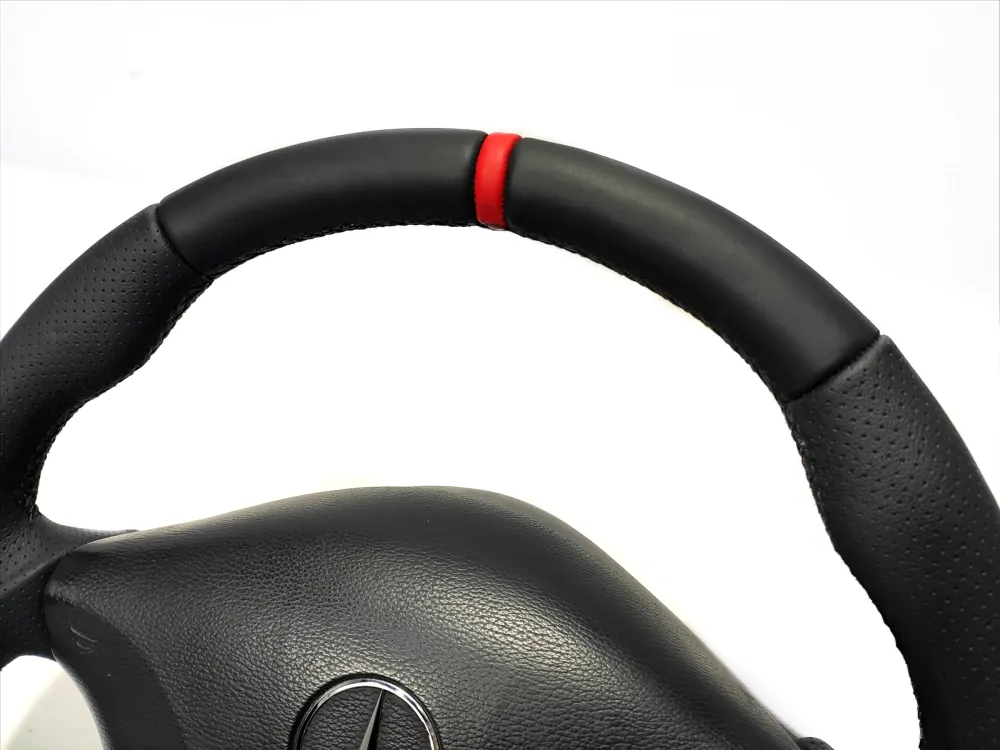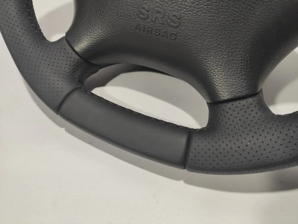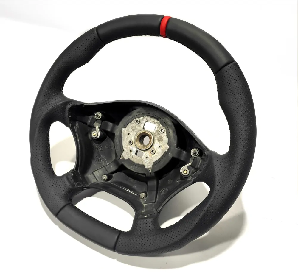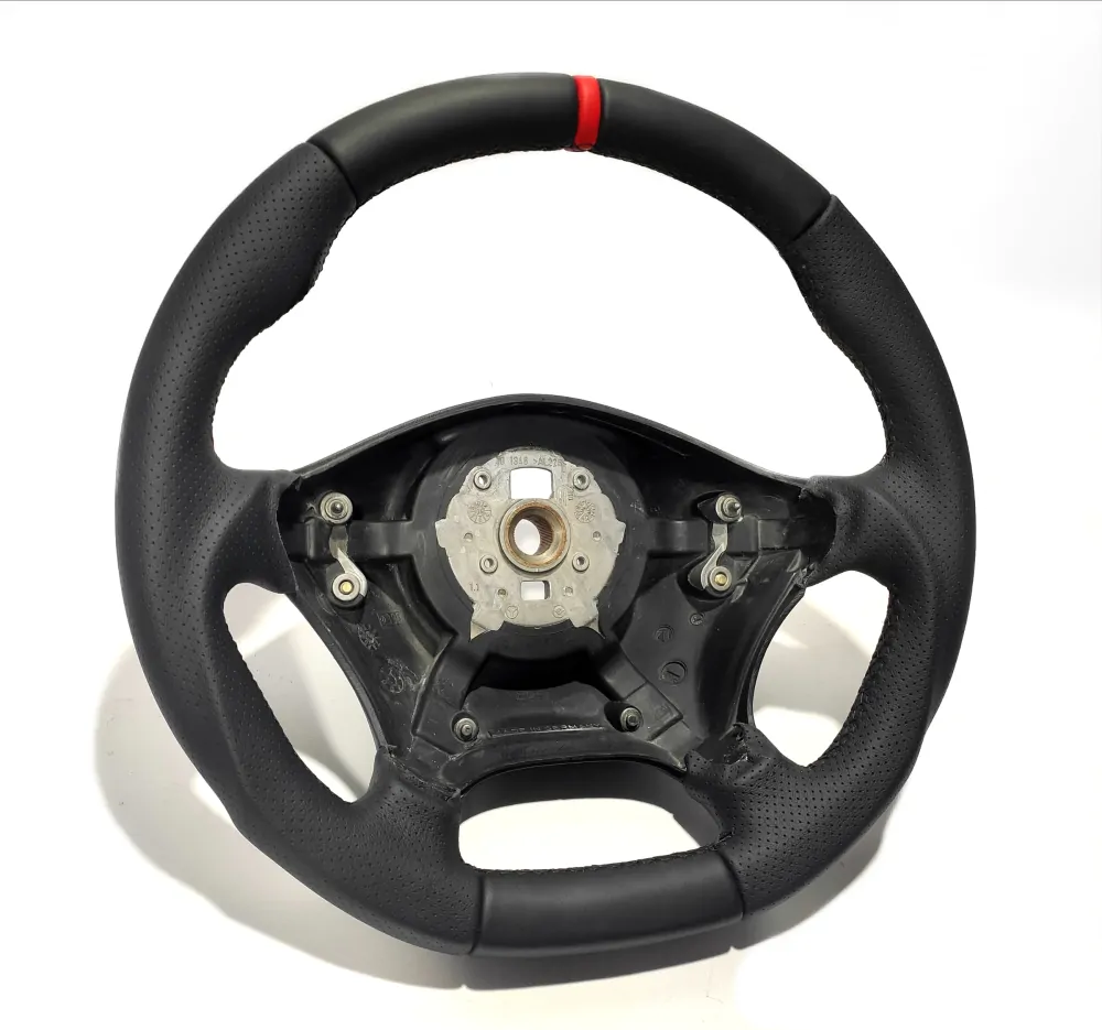 Elegant steering wheel will be a unique addition to the interior of your car! Convenient anatomy, soft -Black original leather in combination with a black perforated leather and Black stitching will cause only pleasant driving sensations! Unique anatomy (Made on polyurethane, not putty). Changed geometry (flat bottom). Red leather 12 o’clock stripe. Authentic. Refurbished. Airbag is not included.