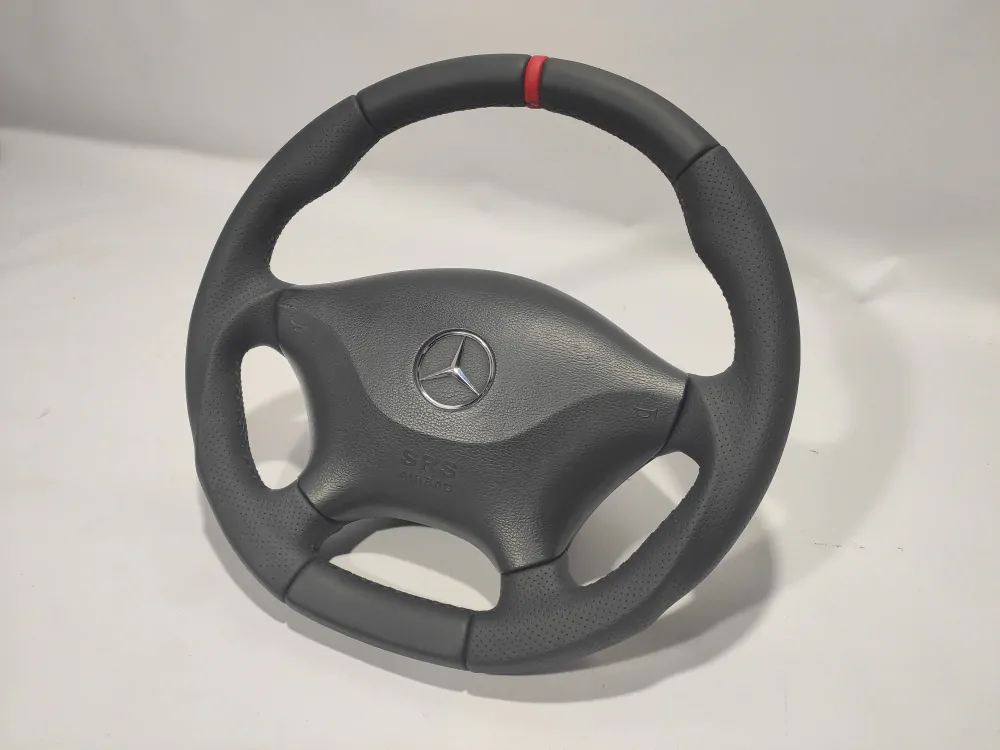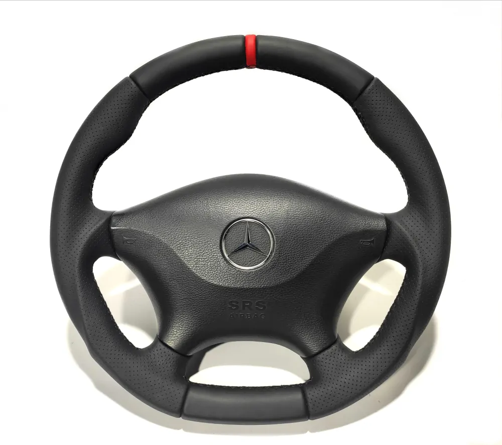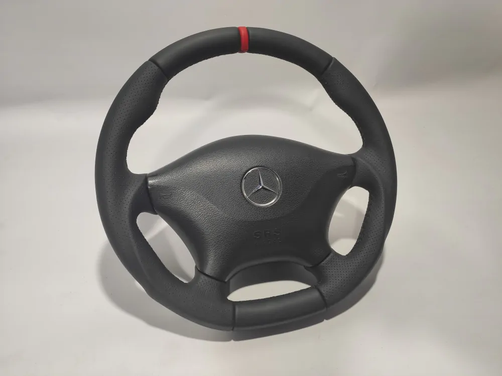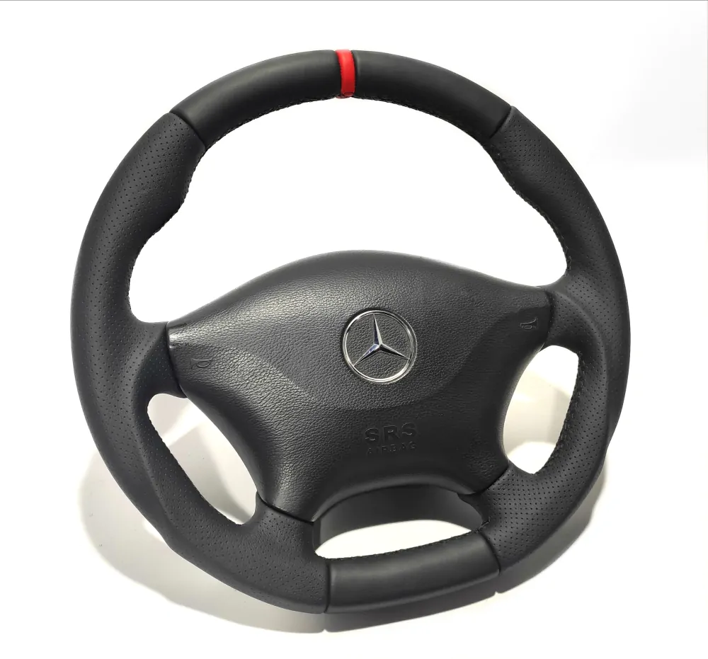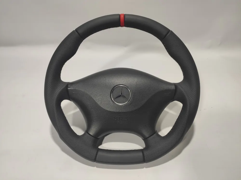 Elegant steering wheel will be a unique addition to the interior of your car! Convenient anatomy, soft -Black original leather in combination with a black perforated leather and Black stitching will cause only pleasant driving sensations! Unique anatomy (Made on polyurethane, not putty). Changed geometry (flat bottom). Red leather 12 o’clock stripe. Authentic. Refurbished. Airbag is not included.