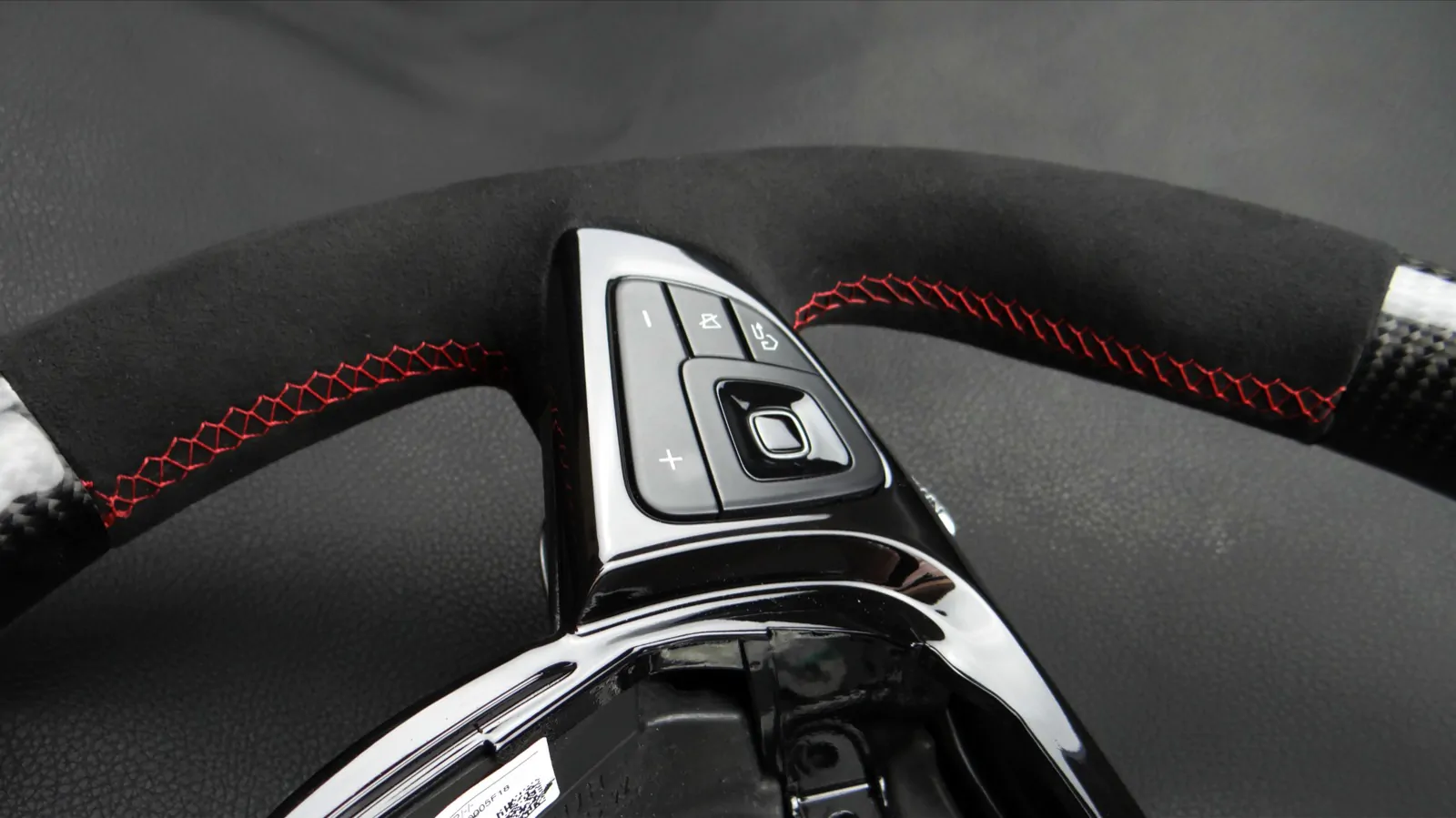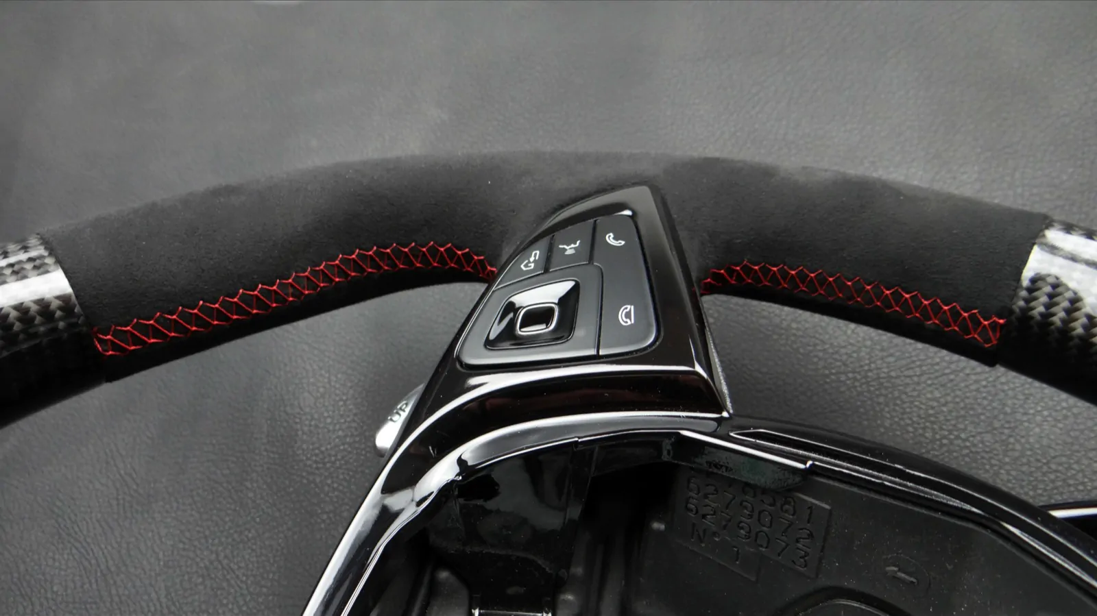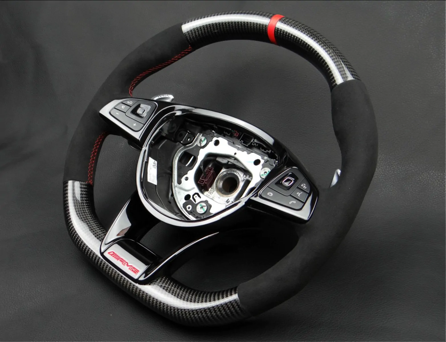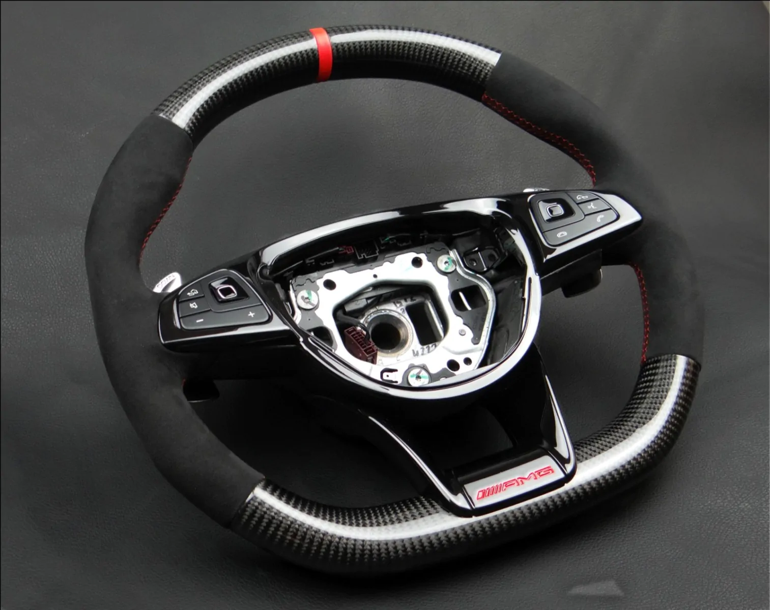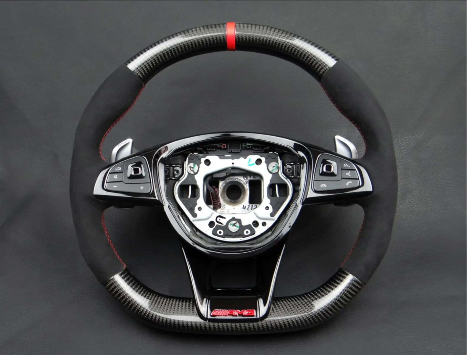Elegant steering wheel will be a unique addition to the interior of your car! Convenient anatomy, soft original skin in combination with a Red stitching will cause only pleasant driving sensations! Unique anatomy (Made on polyurethane, not putty). Changed geometry (flat top and bottom). Inserts made with real carbon fiber. Black glossy center with red “AMG” engraved sign. Stock black paddle shifts. Red 12 o’clock leather stripe.Authentic. Refurbished. Airbag is not included.