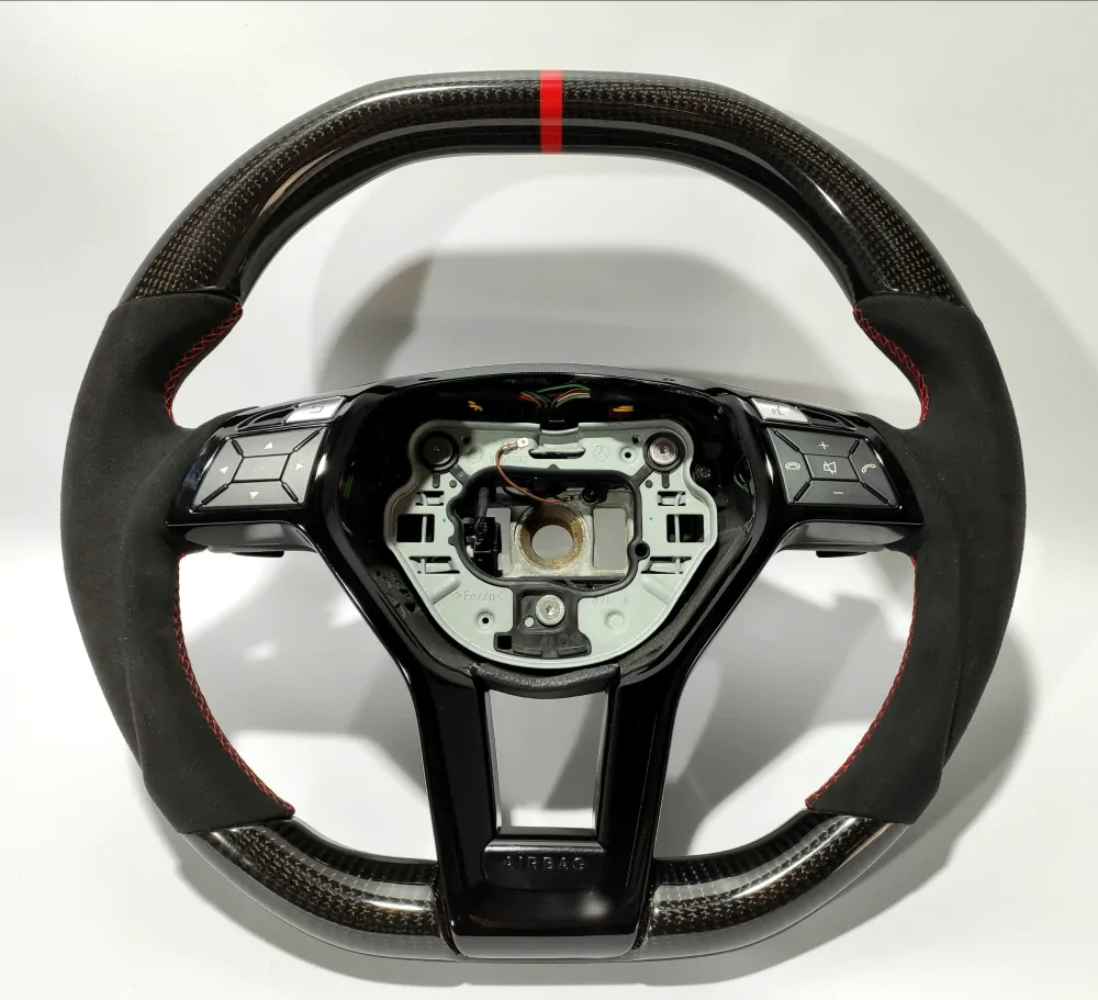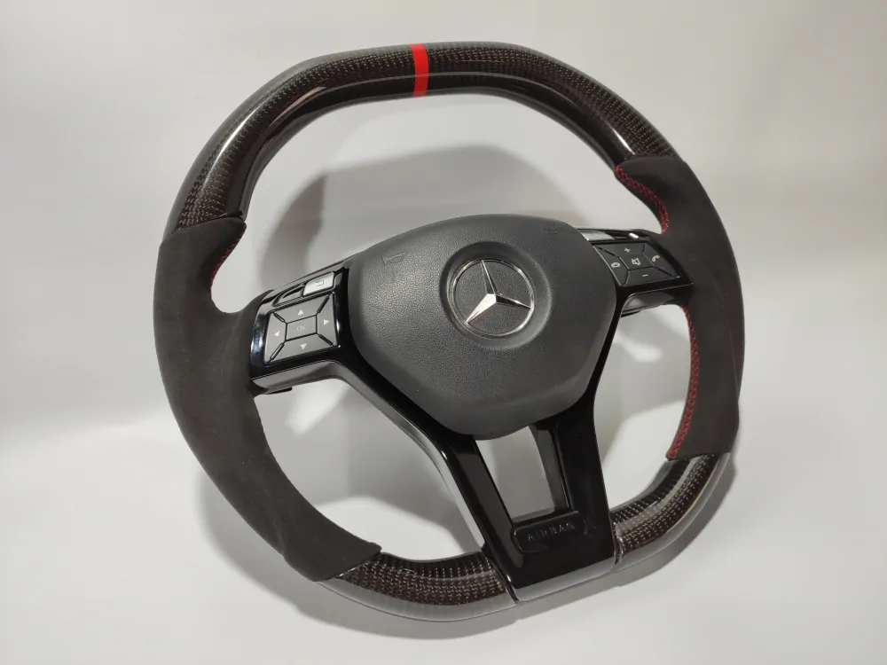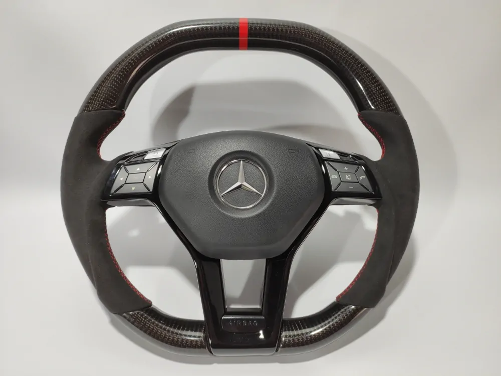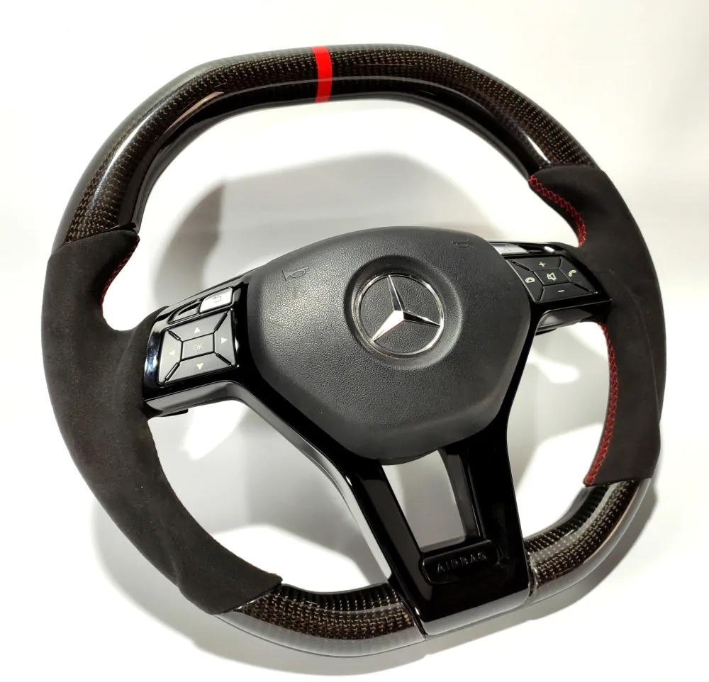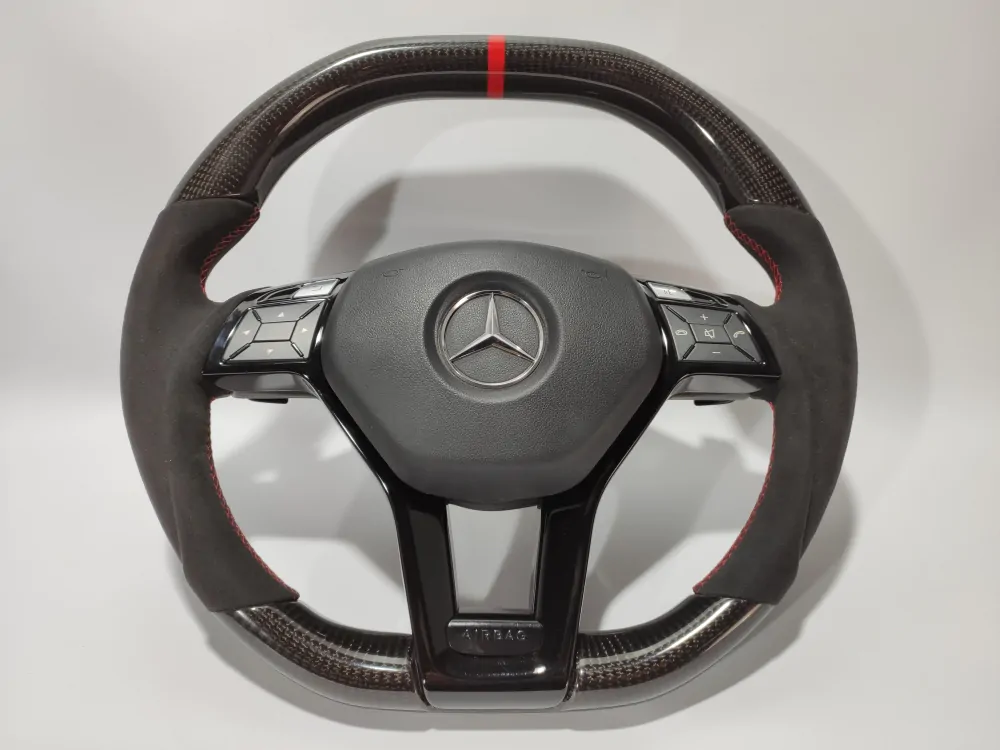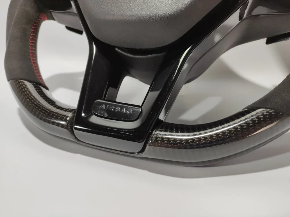 Elegant steering wheel will be a unique addition to the interior of your car! Convenient anatomy, soft original skin in combination with a Red stitching will cause only pleasant driving sensations! Unique anatomy (Made on polyurethane, not putty). Changed geometry (flat top and bottom). Inserts made with real carbon fiber. Black glossy center with “Airbag” engraved badge. Stock black paddle shifts. Red 12 o’clock stripe under coating.Authentic. Refurbished. Airbag is not included.