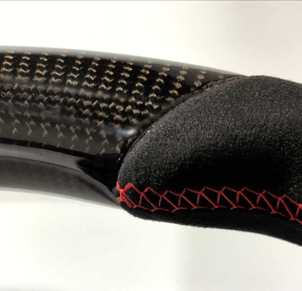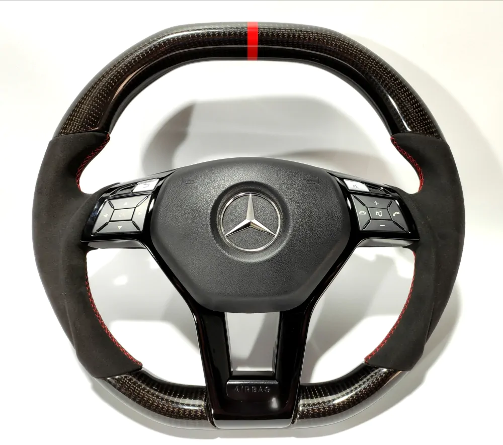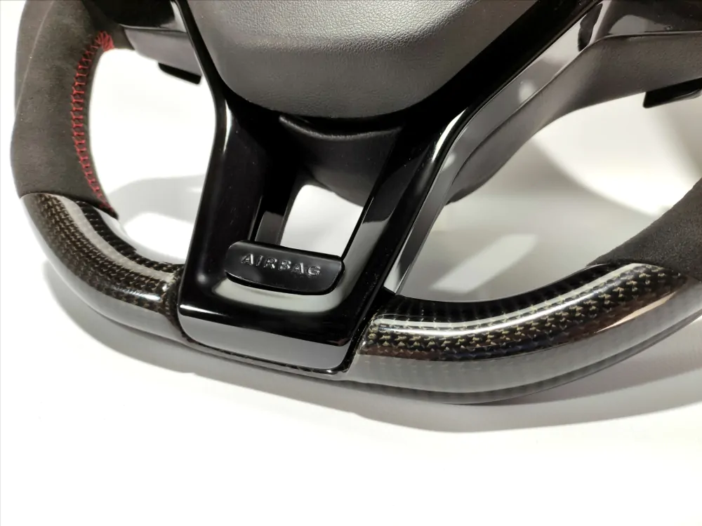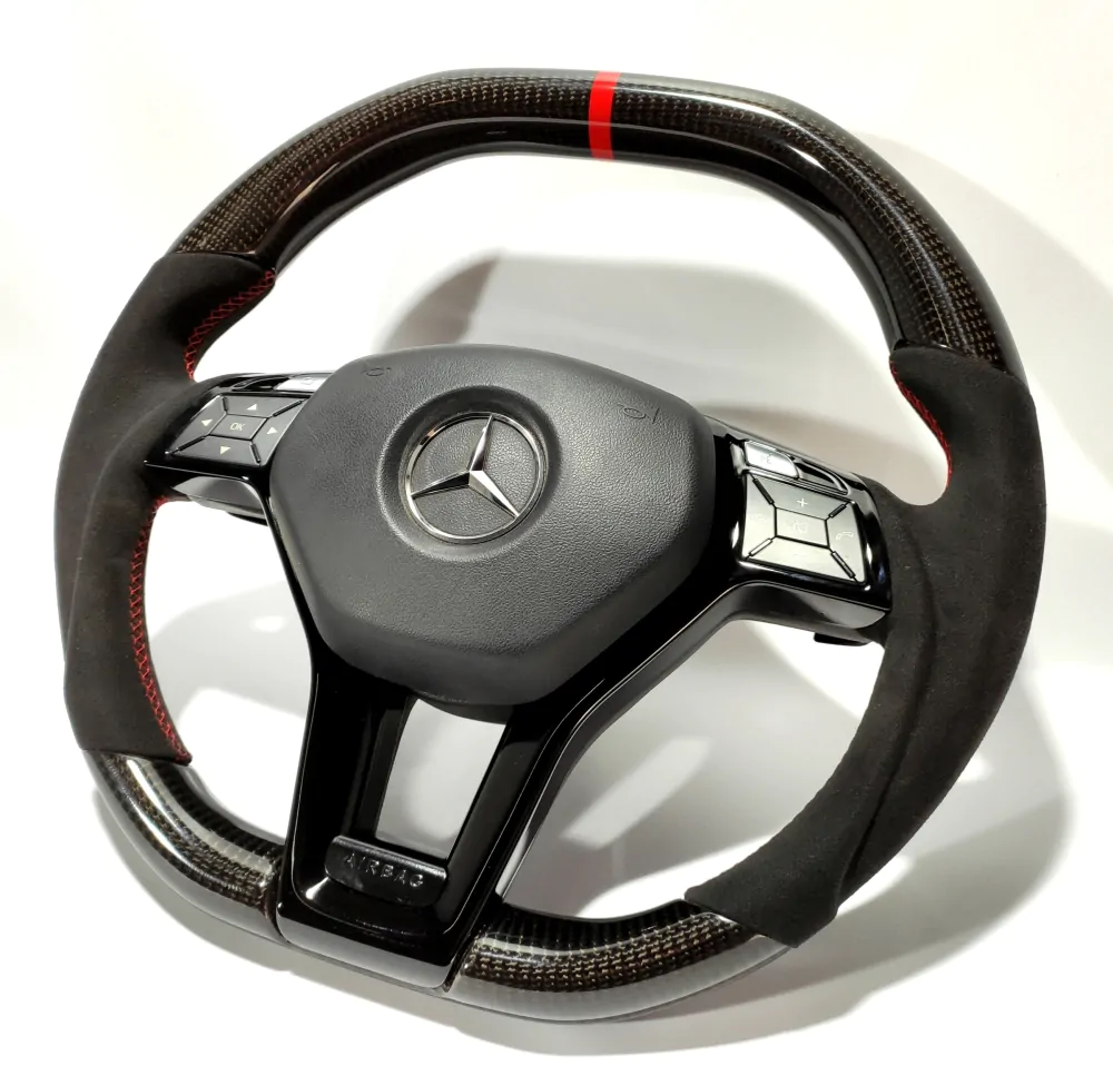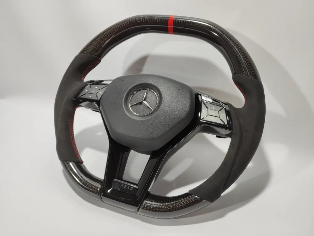 Elegant steering wheel will be a unique addition to the interior of your car! Convenient anatomy, soft original skin in combination with a Red stitching will cause only pleasant driving sensations! Unique anatomy (Made on polyurethane, not putty). Changed geometry (flat top and bottom). Inserts made with real carbon fiber. Black glossy center with “Airbag” engraved badge. Stock black paddle shifts. Red 12 o’clock stripe under coating.Authentic. Refurbished. Airbag is not included.