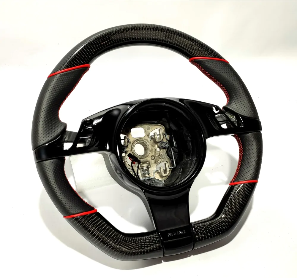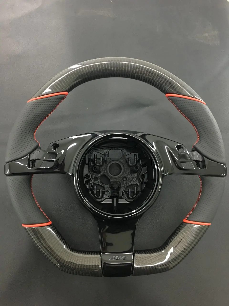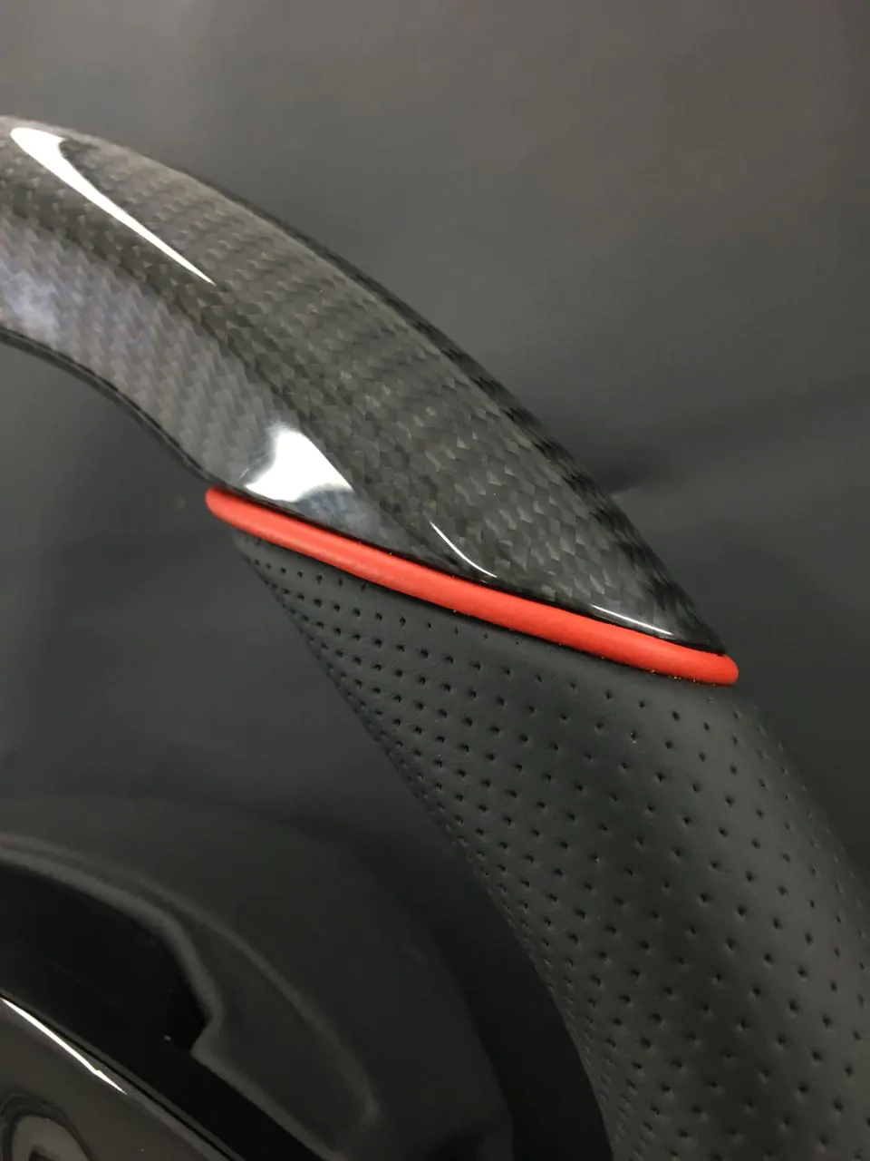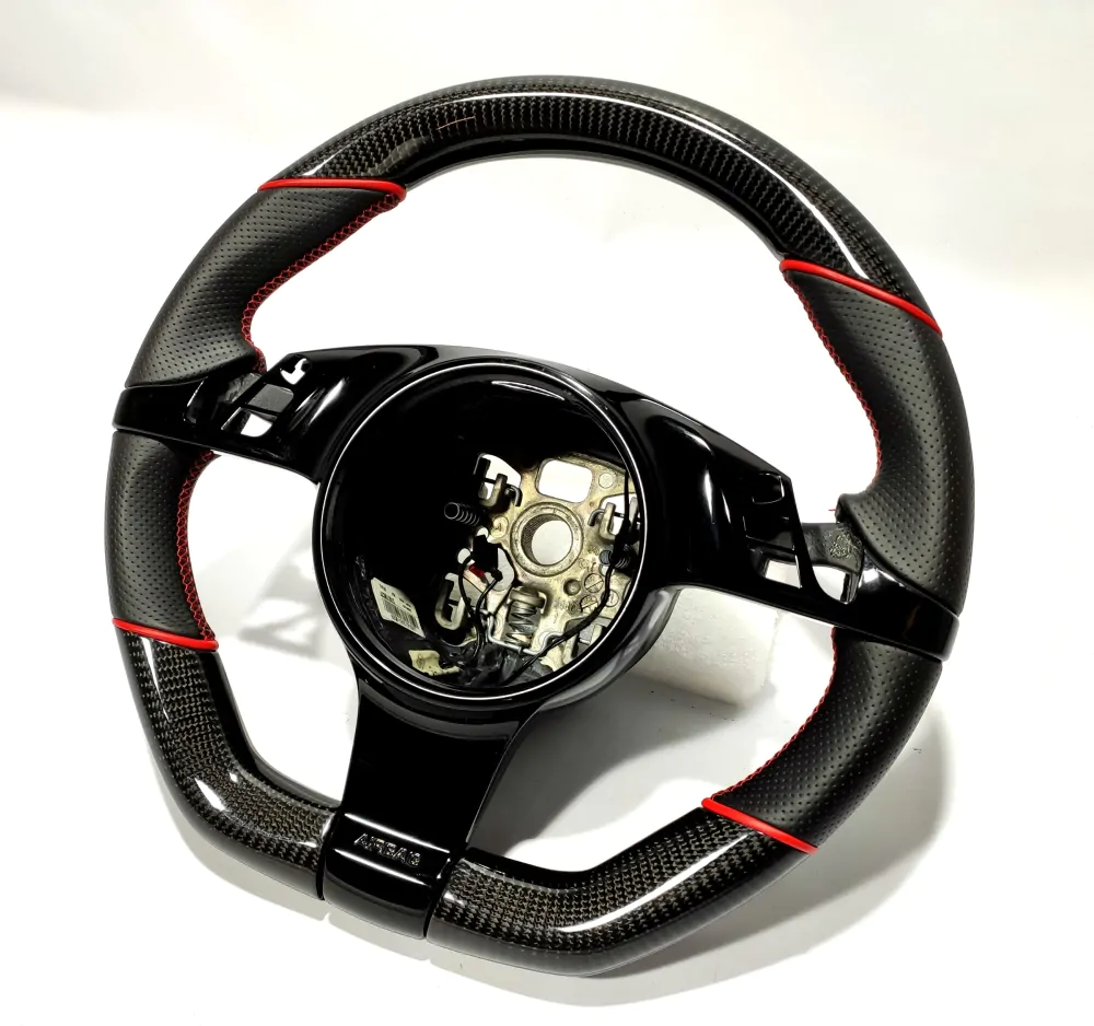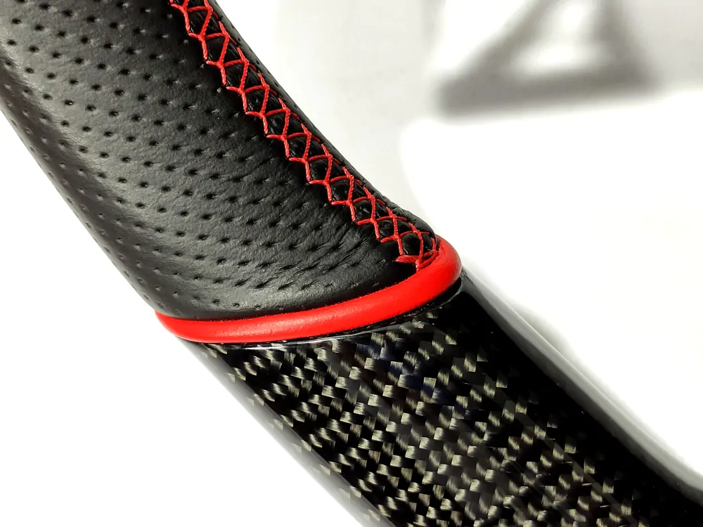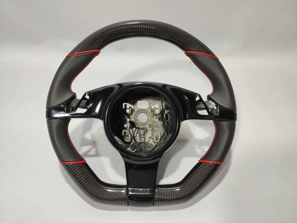 Elegant steering wheel will be a unique addition to the interior of your car! Convenient anatomy, soft original Black perforated leather in combination with a Red stitching will cause only pleasant driving sensations! Unique anatomy (Made on polyurethane, not putty). Changed geometry (flat bottom). Inserts made of real carbon fiber (carbon fiber). Stock center, Piano black lacuqer coated. No buttons , no paddle shifts.Authentic. Refurbished. Airbag is not included.
