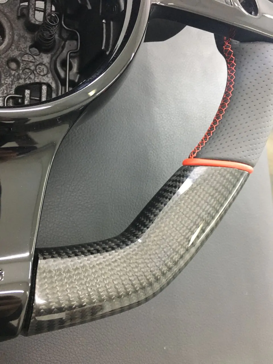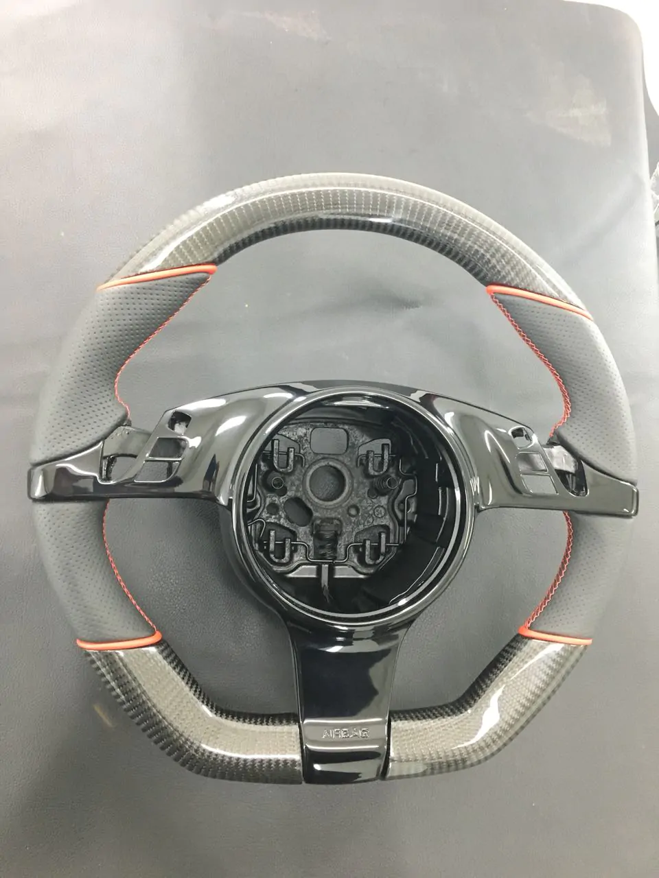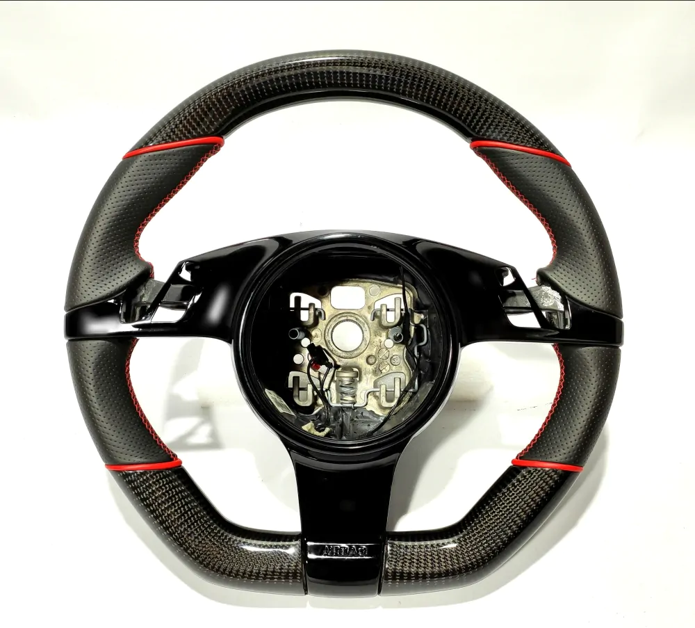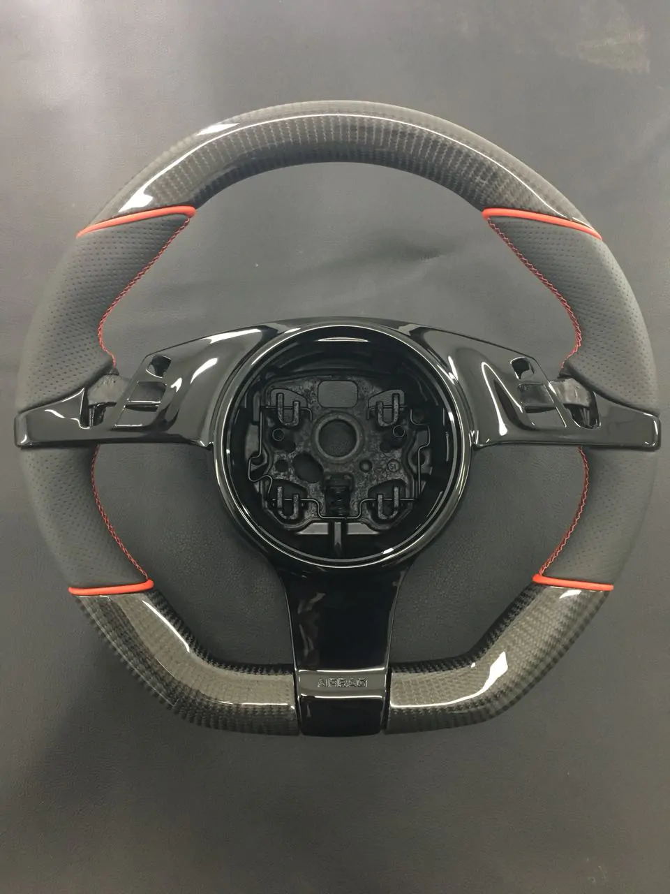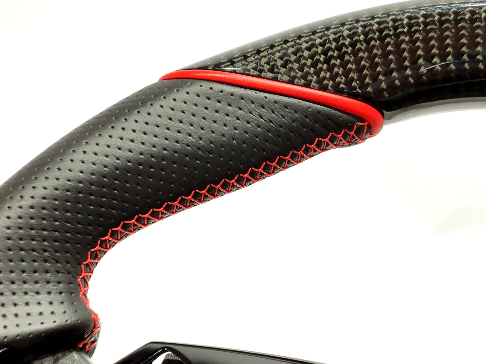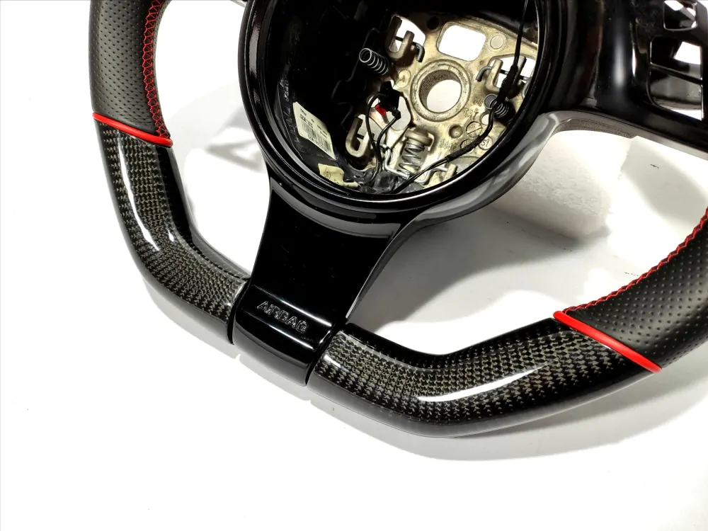 Elegant steering wheel will be a unique addition to the interior of your car! Convenient anatomy, soft original Black perforated leather in combination with a Red stitching will cause only pleasant driving sensations! Unique anatomy (Made on polyurethane, not putty). Changed geometry (flat bottom). Inserts made of real carbon fiber (carbon fiber). Stock center, Piano black lacuqer coated. No buttons , no paddle shifts.Authentic. Refurbished. Airbag is not included.