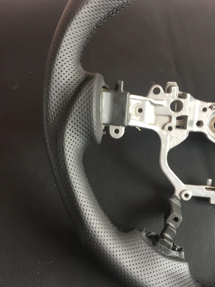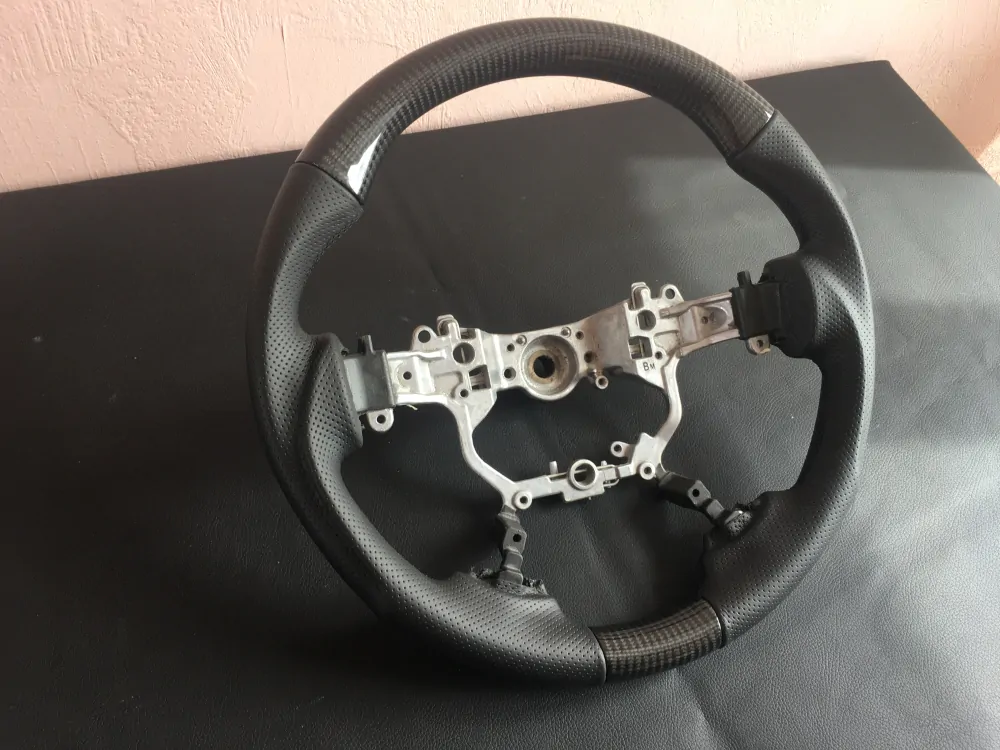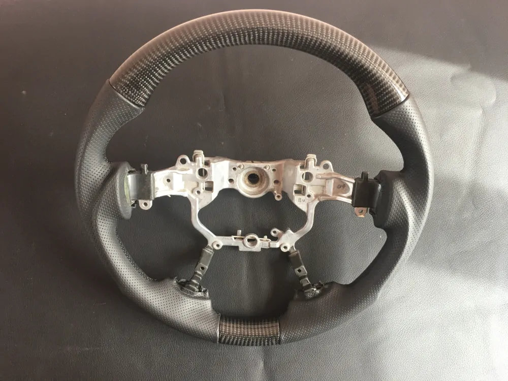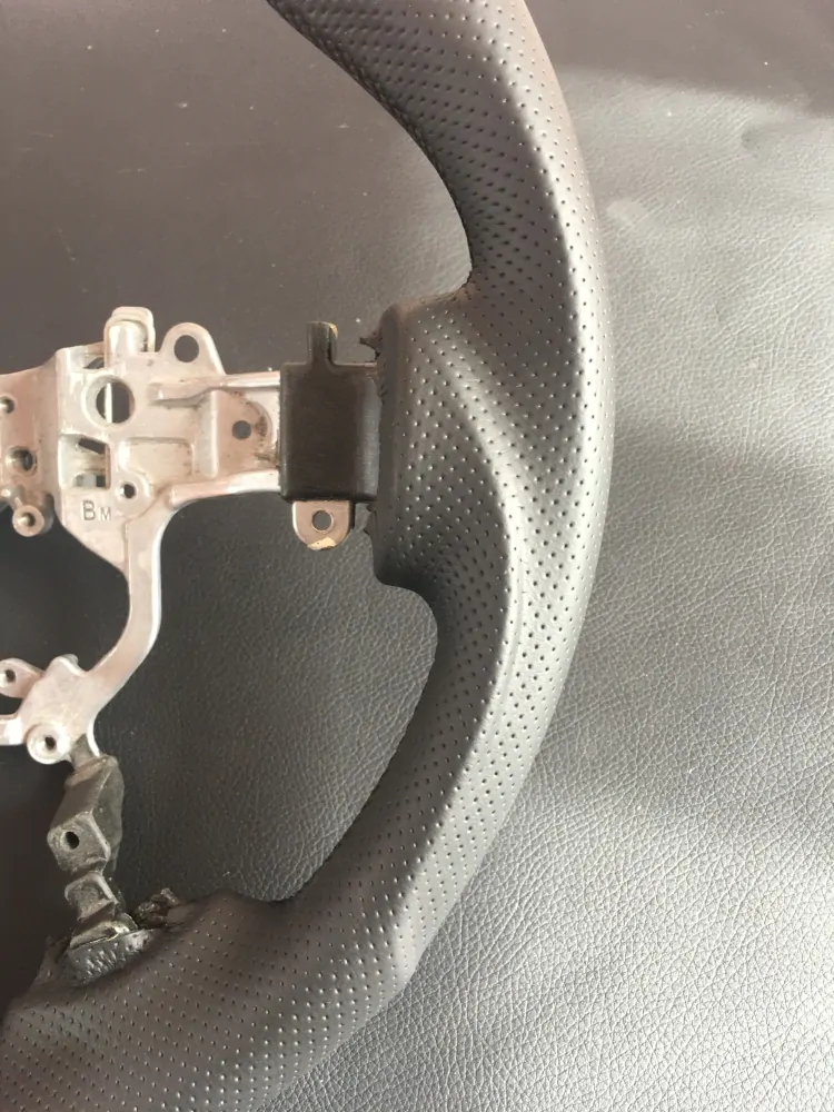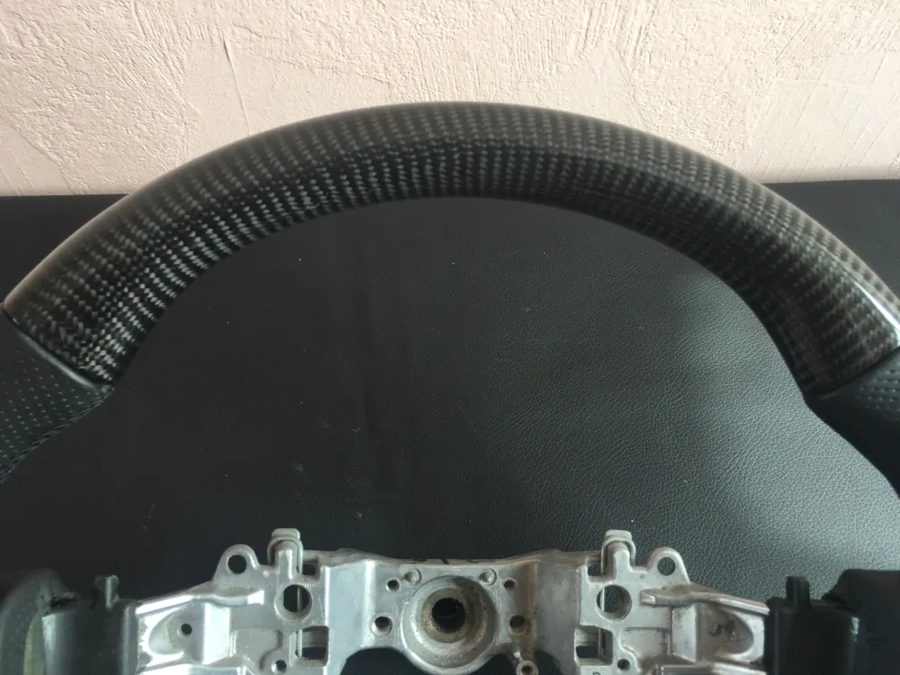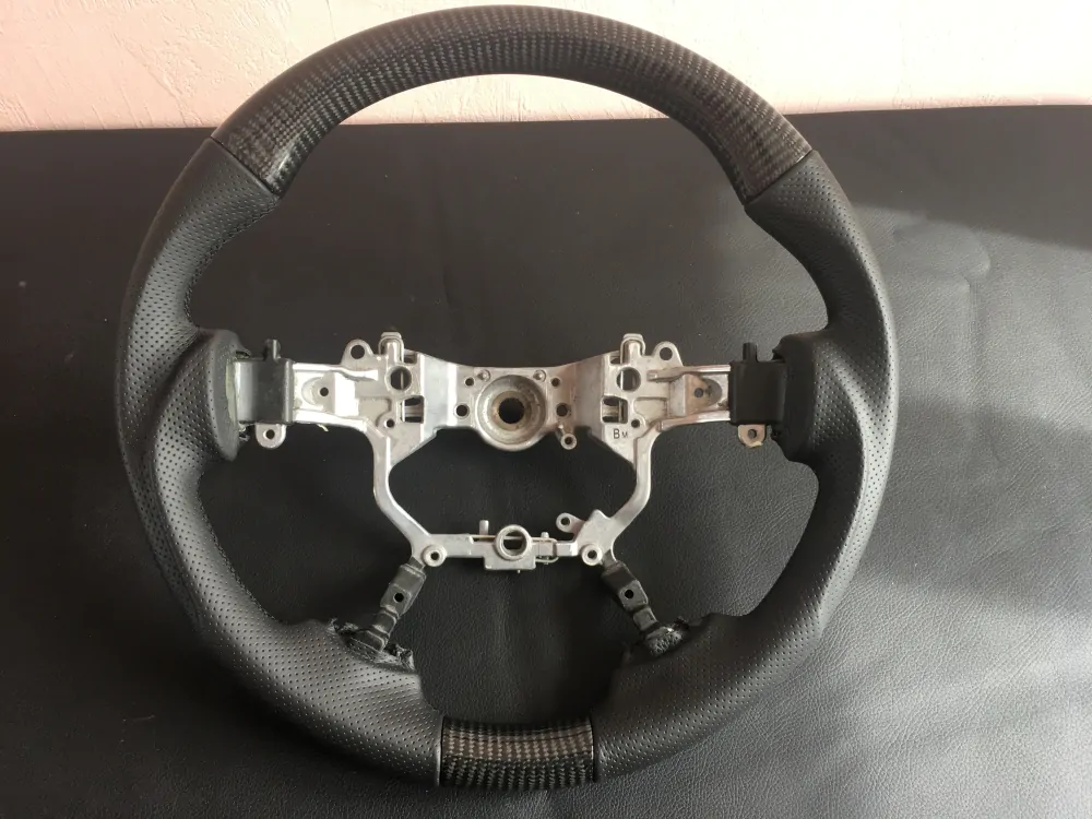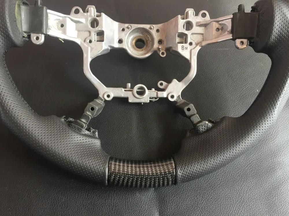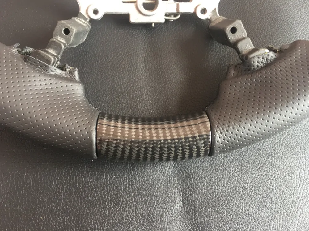 Elegant steering wheel will be a unique addition to the interior of your car! Convenient anatomy, soft original Black leather in combination with a black perforated leather will cause only pleasant driving sensations! Unique anatomy (Made on polyurethane, not putty). Changed geometry (flat bottom). Inserts made with real carbon fiber. Stock metallic center. Authentic. Refurbished. Airbag is not included.