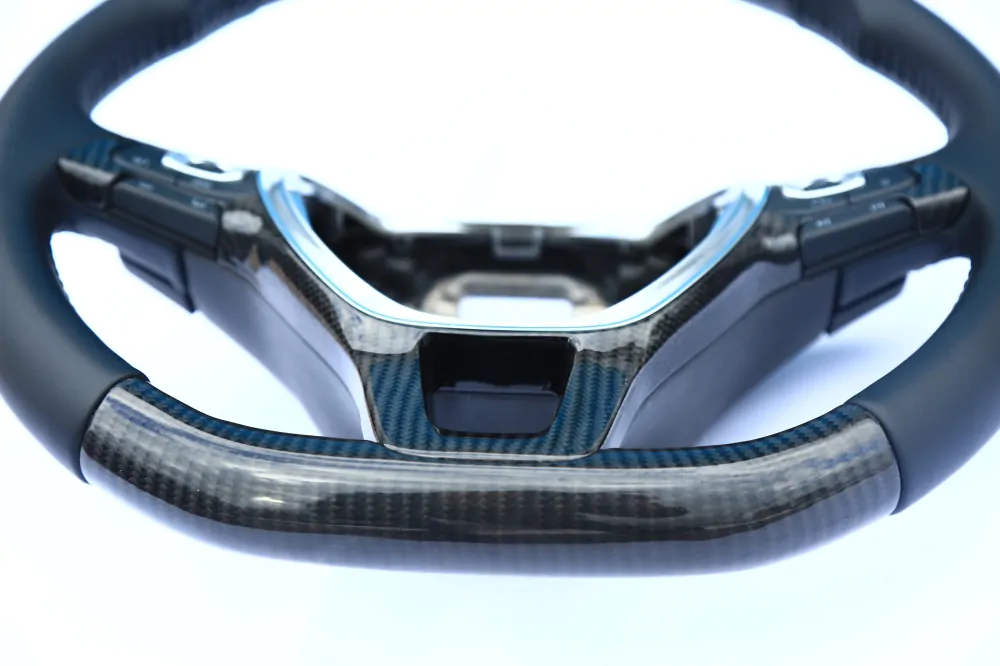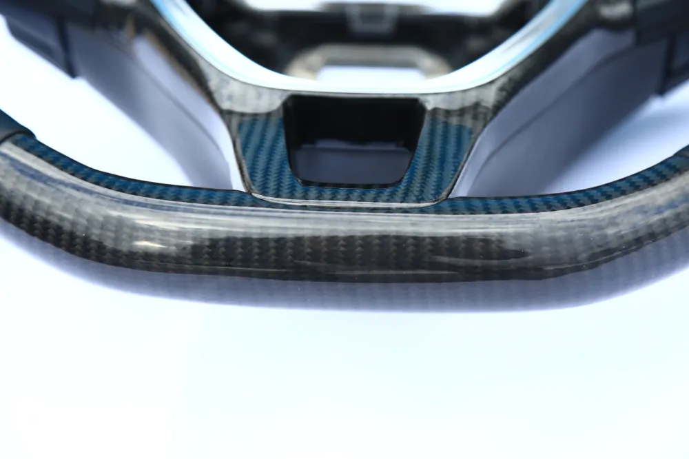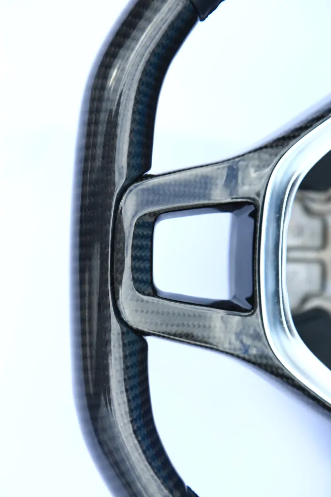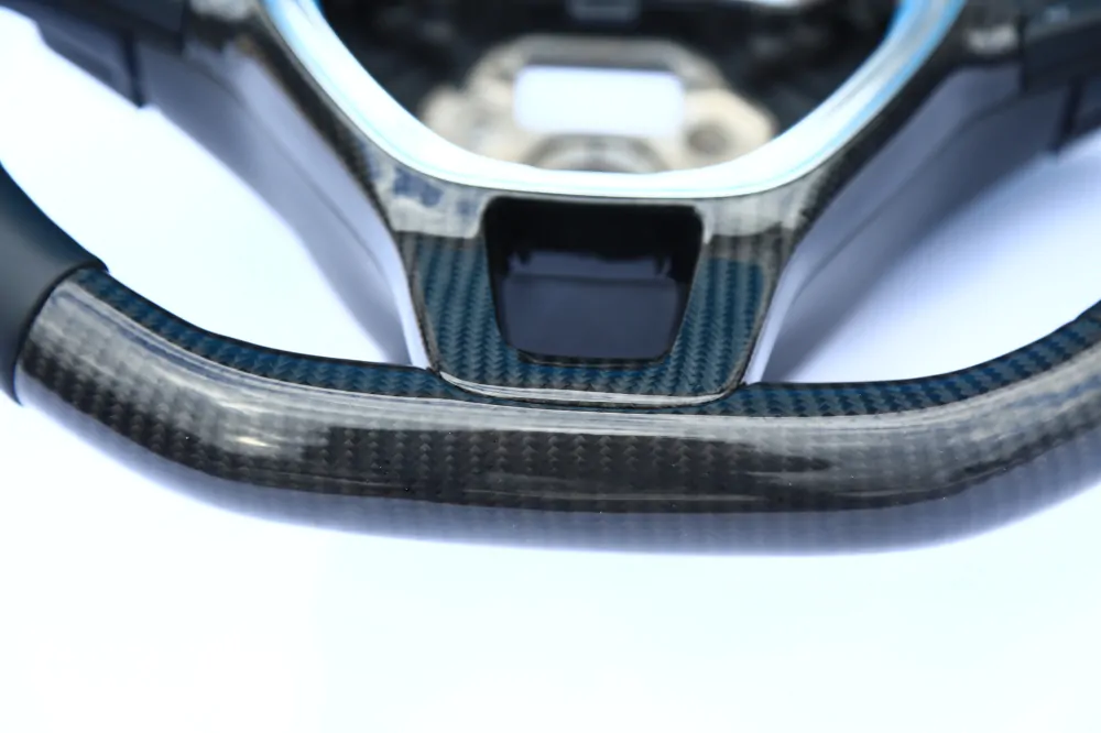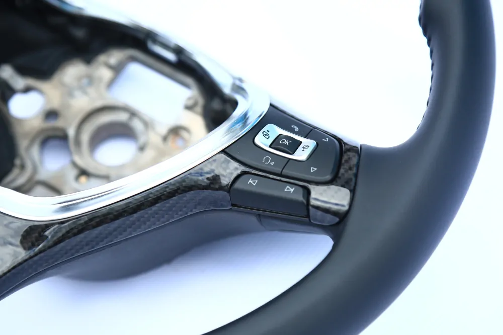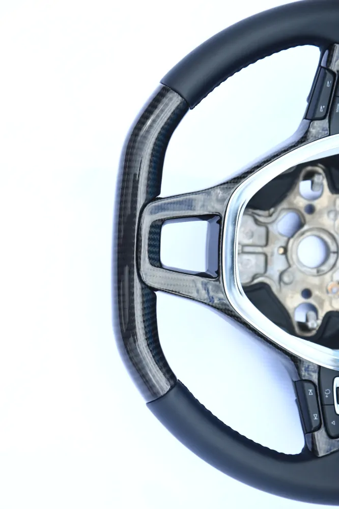 Elegant steering wheel will be a unique addition to the interior of your car! Convenient anatomy, soft original skin in combination with a Black stitching will cause only pleasant driving sensations! Unique anatomy (Made on polyurethane, not putty). Changed geometry (flat bottom). Inserts made with real carbon fiber. Stock metallic center.Authentic. Refurbished. Airbag is not included.
